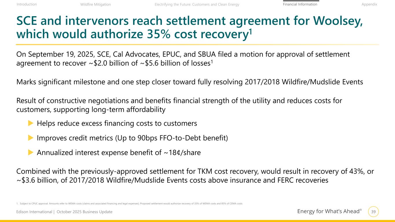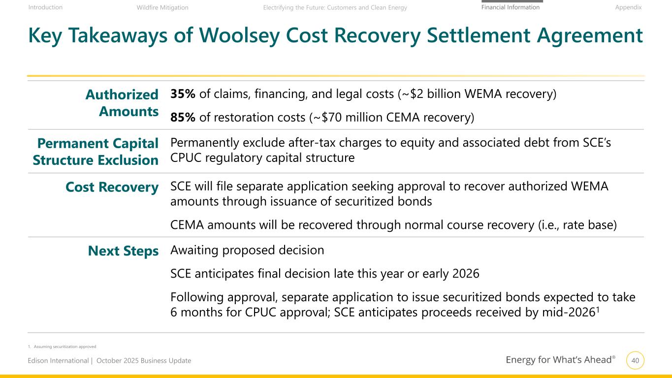 39Edison International | October 2025 Business Update Financial Information AppendixIntroduction Wildfire Mitigation Electrifying the Future: Customers and Clean Energy SCE and intervenors reach settlement agreement for Woolsey, which would authorize 35% cost recovery1 On September 19, 2025, SCE, Cal Advocates, EPUC, and SBUA filed a motion for approval of settlement agreement to recover ~$2.0 billion of ~$5.6 billion of losses1 Marks significant milestone and one step closer toward fully resolving 2017/2018 Wildfire/Mudslide Events Result of constructive negotiations and benefits financial strength of the utility and reduces costs for customers, supporting long-term affordability  Helps reduce excess financing costs to customers  Improves credit metrics (Up to 90bps FFO-to-Debt benefit)  Annualized interest expense benefit of ~18¢/share Combined with the previously-approved settlement for TKM cost recovery, would result in recovery of 43%, or ~$3.6 billion, of 2017/2018 Wildfire/Mudslide Events costs above insurance and FERC recoveries 1. Subject to CPUC approval. Amounts refer to WEMA costs (claims and associated financing and legal expenses). Proposed settlement would authorize recovery of 35% of WEMA costs and 85% of CEMA costs