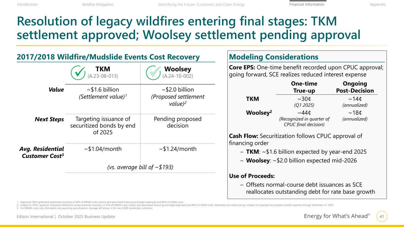 41Edison International | October 2025 Business Update Financial Information AppendixIntroduction Wildfire Mitigation Electrifying the Future: Customers and Clean Energy Resolution of legacy wildfires entering final stages: TKM settlement approved; Woolsey settlement pending approval TKM (A.23-08-013) Woolsey (A.24-10-002) Value ~$1.6 billion (Settlement value)1 ~$2.0 billion (Proposed settlement value)2 Next Steps Targeting issuance of securitized bonds by end of 2025 Pending proposed decision Avg. Residential Customer Cost3 ~$1.04/month ~$1.24/month (vs. average bill of ~$193) Modeling Considerations2017/2018 Wildfire/Mudslide Events Cost Recovery 1. Approved TKM settlement authorizes recovery of 60% of WEMA costs (claims and associated financing and legal expenses) and 85% of CEMA costs 2. Subject to CPUC approval. Proposed settlement would authorize recovery of 35% of WEMA costs (claims and associated financing and legal expenses) and 85% of CEMA costs. Estimated one-time true-up is based on expected recoverable interest expense through December 31, 2025 3. For WEMA costs only. Estimated cost assuming securitization. Average bill shown is for non-CARE residential customers Core EPS: One-time benefit recorded upon CPUC approval; going forward, SCE realizes reduced interest expense Cash Flow: Securitization follows CPUC approval of financing order – TKM: ~$1.6 billion expected by year-end 2025 – Woolsey: ~$2.0 billion expected mid-2026 Use of Proceeds: – Offsets normal-course debt issuances as SCE reallocates outstanding debt for rate base growth  One-time True-up Ongoing Post-Decision TKM ~30¢ (Q1 2025) ~14¢ (annualized) Woolsey2 ~44¢ (Recognized in quarter of CPUC final decision) ~18¢ (annualized)