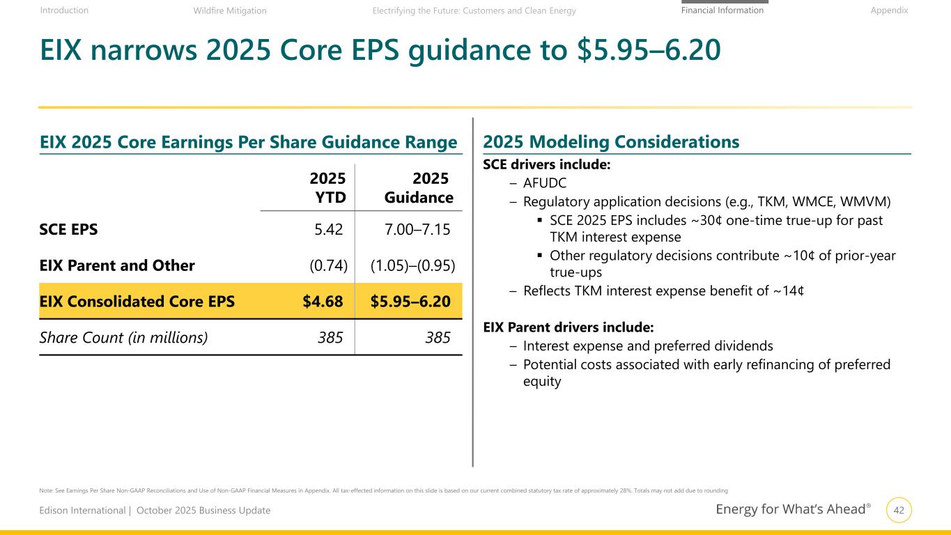 42Edison International | October 2025 Business Update Financial Information AppendixIntroduction Wildfire Mitigation Electrifying the Future: Customers and Clean Energy Note: See Earnings Per Share Non-GAAP Reconciliations and Use of Non-GAAP Financial Measures in Appendix. All tax-effected information on this slide is based on our current combined statutory tax rate of approximately 28%. Totals may not add due to rounding EIX 2025 Core Earnings Per Share Guidance Range 2025 Modeling Considerations 2025 YTD 2025 Guidance SCE EPS 5.42 7.00–7.15 EIX Parent and Other (0.74) (1.05)–(0.95) EIX Consolidated Core EPS $4.68 $5.95–6.20 Share Count (in millions) 385 385 SCE drivers include: – AFUDC – Regulatory application decisions (e.g., TKM, WMCE, WMVM)  SCE 2025 EPS includes ~30¢ one-time true-up for past TKM interest expense  Other regulatory decisions contribute ~10¢ of prior-year true-ups – Reflects TKM interest expense benefit of ~14¢ EIX Parent drivers include: – Interest expense and preferred dividends – Potential costs associated with early refinancing of preferred equity EIX narrows 2025 Core EPS guidance to $5.95–6.20