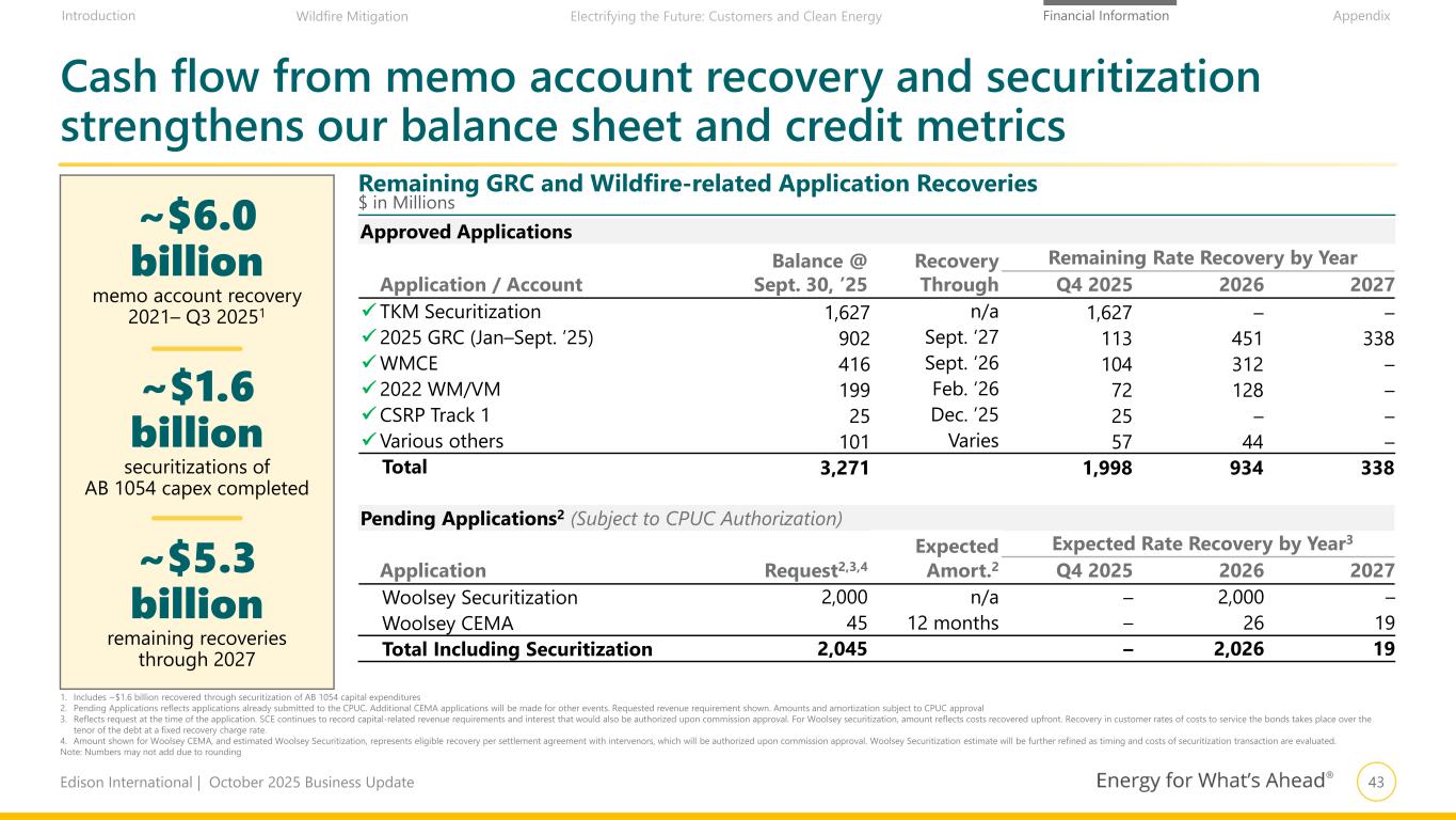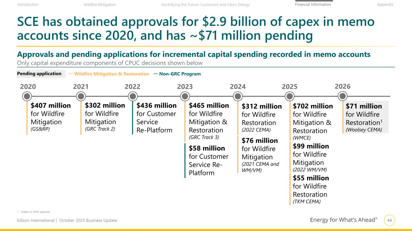43Edison International | October 2025 Business Update Financial Information AppendixIntroduction Wildfire Mitigation Electrifying the Future: Customers and Clean Energy ~$6.0 billion memo account recovery 2021– Q3 20251 ~$1.6 billion securitizations of AB 1054 capex completed ~$5.3 billion remaining recoveries through 2027 Cash flow from memo account recovery and securitization strengthens our balance sheet and credit metrics Approved Applications Application / Account Balance @ Sept. 30, ’25 Recovery Through Remaining Rate Recovery by Year Q4 2025 2026 2027  TKM Securitization 1,627 n/a 1,627 – –  2025 GRC (Jan–Sept. ’25) 902 Sept. ‘27 113 451 338 WMCE 416 Sept. ‘26 104 312 –  2022 WM/VM 199 Feb. ‘26 72 128 – CSRP Track 1 25 Dec. ’25 25 – – Various others 101 Varies 57 44 – Total 3,271 1,998 934 338 Pending Applications2 (Subject to CPUC Authorization) Application Request2,3,4 Expected Amort.2 Expected Rate Recovery by Year3 Q4 2025 2026 2027 Woolsey Securitization 2,000 n/a – 2,000 – Woolsey CEMA 45 12 months – 26 19 Total Including Securitization 2,045 – 2,026 19 1. Includes ~$1.6 billion recovered through securitization of AB 1054 capital expenditures 2. Pending Applications reflects applications already submitted to the CPUC. Additional CEMA applications will be made for other events. Requested revenue requirement shown. Amounts and amortization subject to CPUC approval 3. Reflects request at the time of the application. SCE continues to record capital-related revenue requirements and interest that would also be authorized upon commission approval. For Woolsey securitization, amount reflects costs recovered upfront. Recovery in customer rates of costs to service the bonds takes place over the tenor of the debt at a fixed recovery charge rate. 4. Amount shown for Woolsey CEMA, and estimated Woolsey Securitization, represents eligible recovery per settlement agreement with intervenors, which will be authorized upon commission approval. Woolsey Securitization estimate will be further refined as timing and costs of securitization transaction are evaluated. Note: Numbers may not add due to rounding Remaining GRC and Wildfire-related Application Recoveries $ in Millions