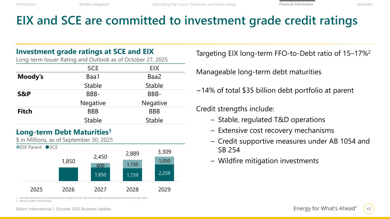 45Edison International | October 2025 Business Update Financial Information AppendixIntroduction Wildfire Mitigation Electrifying the Future: Customers and Clean Energy EIX and SCE are committed to investment grade credit ratings 1. Excludes amortization of securitized bonds related to SCE’s AB 1054 Excluded Capital Expenditures and short-term debt 2. Based on S&P’s methodology SCE EIX Moody’s Baa1 Stable Baa2 Stable S&P BBB- Negative BBB- Negative Fitch BBB Stable BBB Stable Targeting EIX long-term FFO-to-Debt ratio of 15–17%2 Manageable long-term debt maturities ~14% of total $35 billion debt portfolio at parent Credit strengths include: – Stable, regulated T&D operations – Extensive cost recovery mechanisms – Credit supportive measures under AB 1054 and SB 254 – Wildfire mitigation investments Investment grade ratings at SCE and EIX Long-term Issuer Rating and Outlook as of October 27, 2025 Long-term Debt Maturities1 $ in Millions, as of September 30, 2025 SCEEIX Parent 1,850 1,739 2,259 600 1,150 1,050 1,850 2,450 2,889 3,309 2025 2026 2027 2028 2029