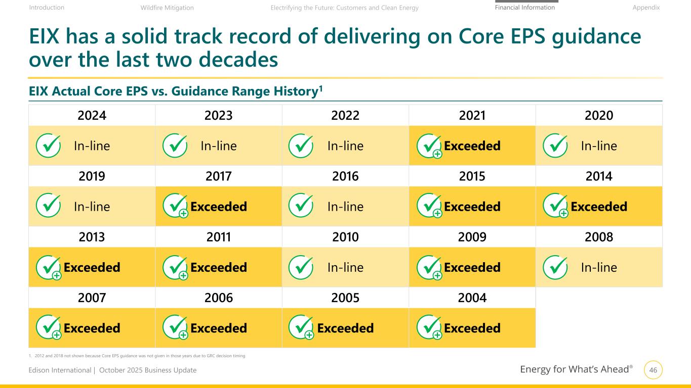 46Edison International | October 2025 Business Update Financial Information AppendixIntroduction Wildfire Mitigation Electrifying the Future: Customers and Clean Energy EIX has a solid track record of delivering on Core EPS guidance over the last two decades 2024 2023 2022 2021 2020 In-line In-line In-line Exceeded In-line 2019 2017 2016 2015 2014 In-line Exceeded In-line Exceeded Exceeded 2013 2011 2010 2009 2008 Exceeded Exceeded In-line Exceeded In-line 2007 2006 2005 2004 Exceeded Exceeded Exceeded Exceeded EIX Actual Core EPS vs. Guidance Range History1    1. 2012 and 2018 not shown because Core EPS guidance was not given in those years due to GRC decision timing   + +  +++  + + + + + +