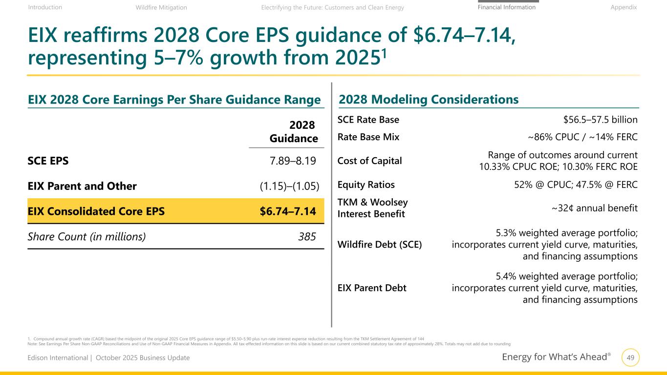 49Edison International | October 2025 Business Update Financial Information AppendixIntroduction Wildfire Mitigation Electrifying the Future: Customers and Clean Energy 1. Compound annual growth rate (CAGR) based the midpoint of the original 2025 Core EPS guidance range of $5.50–5.90 plus run-rate interest expense reduction resulting from the TKM Settlement Agreement of 14¢ Note: See Earnings Per Share Non-GAAP Reconciliations and Use of Non-GAAP Financial Measures in Appendix. All tax-effected information on this slide is based on our current combined statutory tax rate of approximately 28%. Totals may not add due to rounding EIX 2028 Core Earnings Per Share Guidance Range 2028 Modeling Considerations 2028 Guidance SCE EPS 7.89–8.19 EIX Parent and Other (1.15)–(1.05) EIX Consolidated Core EPS $6.74–7.14 Share Count (in millions) 385 EIX reaffirms 2028 Core EPS guidance of $6.74–7.14, representing 5–7% growth from 20251 SCE Rate Base $56.5–57.5 billion Rate Base Mix ~86% CPUC / ~14% FERC Cost of Capital Range of outcomes around current 10.33% CPUC ROE; 10.30% FERC ROE Equity Ratios 52% @ CPUC; 47.5% @ FERC TKM & Woolsey Interest Benefit ~32¢ annual benefit Wildfire Debt (SCE) 5.3% weighted average portfolio; incorporates current yield curve, maturities, and financing assumptions EIX Parent Debt 5.4% weighted average portfolio; incorporates current yield curve, maturities, and financing assumptions