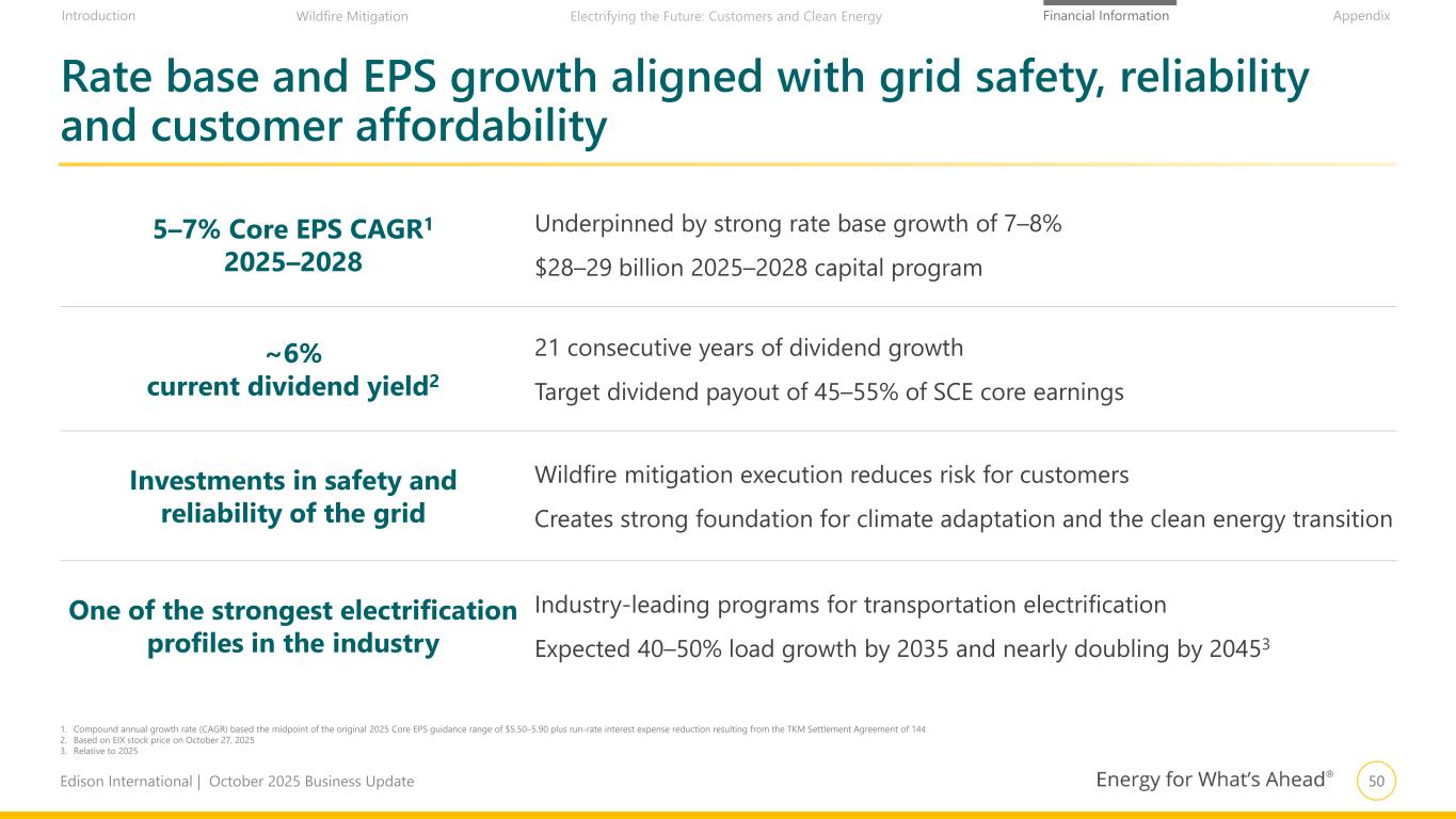 50Edison International | October 2025 Business Update Financial Information AppendixIntroduction Wildfire Mitigation Electrifying the Future: Customers and Clean Energy Rate base and EPS growth aligned with grid safety, reliability and customer affordability 1. Compound annual growth rate (CAGR) based the midpoint of the original 2025 Core EPS guidance range of $5.50–5.90 plus run-rate interest expense reduction resulting from the TKM Settlement Agreement of 14¢ 2. Based on EIX stock price on October 27, 2025 3. Relative to 2025 5–7% Core EPS CAGR1 2025–2028 Underpinned by strong rate base growth of 7–8% $28–29 billion 2025–2028 capital program ~6% current dividend yield2 21 consecutive years of dividend growth Target dividend payout of 45–55% of SCE core earnings Investments in safety and reliability of the grid Wildfire mitigation execution reduces risk for customers Creates strong foundation for climate adaptation and the clean energy transition One of the strongest electrification profiles in the industry Industry-leading programs for transportation electrification Expected 40–50% load growth by 2035 and nearly doubling by 20453