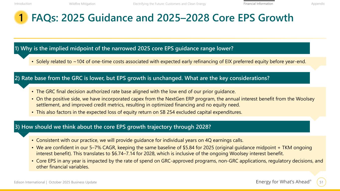 51Edison International | October 2025 Business Update Financial Information AppendixIntroduction Wildfire Mitigation Electrifying the Future: Customers and Clean Energy FAQs: 2025 Guidance and 2025–2028 Core EPS Growth1 2) Rate base from the GRC is lower, but EPS growth is unchanged. What are the key considerations? • The GRC final decision authorized rate base aligned with the low end of our prior guidance. • On the positive side, we have incorporated capex from the NextGen ERP program, the annual interest benefit from the Woolsey settlement, and improved credit metrics, resulting in optimized financing and no equity need. • This also factors in the expected loss of equity return on SB 254 excluded capital expenditures. 1) Why is the implied midpoint of the narrowed 2025 core EPS guidance range lower? • Solely related to ~10¢ of one-time costs associated with expected early refinancing of EIX preferred equity before year-end. 3) How should we think about the core EPS growth trajectory through 2028? • Consistent with our practice, we will provide guidance for individual years on 4Q earnings calls. • We are confident in our 5–7% CAGR, keeping the same baseline of $5.84 for 2025 (original guidance midpoint + TKM ongoing interest benefit). This translates to $6.74–7.14 for 2028, which is inclusive of the ongoing Woolsey interest benefit. • Core EPS in any year is impacted by the rate of spend on GRC-approved programs, non-GRC applications, regulatory decisions, and other financial variables.