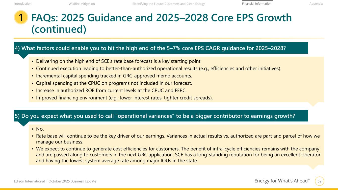 52Edison International | October 2025 Business Update Financial Information AppendixIntroduction Wildfire Mitigation Electrifying the Future: Customers and Clean Energy FAQs: 2025 Guidance and 2025–2028 Core EPS Growth (continued) 1 4) What factors could enable you to hit the high end of the 5–7% core EPS CAGR guidance for 2025–2028? • Delivering on the high end of SCE’s rate base forecast is a key starting point. • Continued execution leading to better-than-authorized operational results (e.g., efficiencies and other initiatives). • Incremental capital spending tracked in GRC-approved memo accounts. • Capital spending at the CPUC on programs not included in our forecast. • Increase in authorized ROE from current levels at the CPUC and FERC. • Improved financing environment (e.g., lower interest rates, tighter credit spreads). 5) Do you expect what you used to call “operational variances” to be a bigger contributor to earnings growth? • No. • Rate base will continue to be the key driver of our earnings. Variances in actual results vs. authorized are part and parcel of how we manage our business. • We expect to continue to generate cost efficiencies for customers. The benefit of intra-cycle efficiencies remains with the company and are passed along to customers in the next GRC application. SCE has a long-standing reputation for being an excellent operator and having the lowest system average rate among major IOUs in the state.