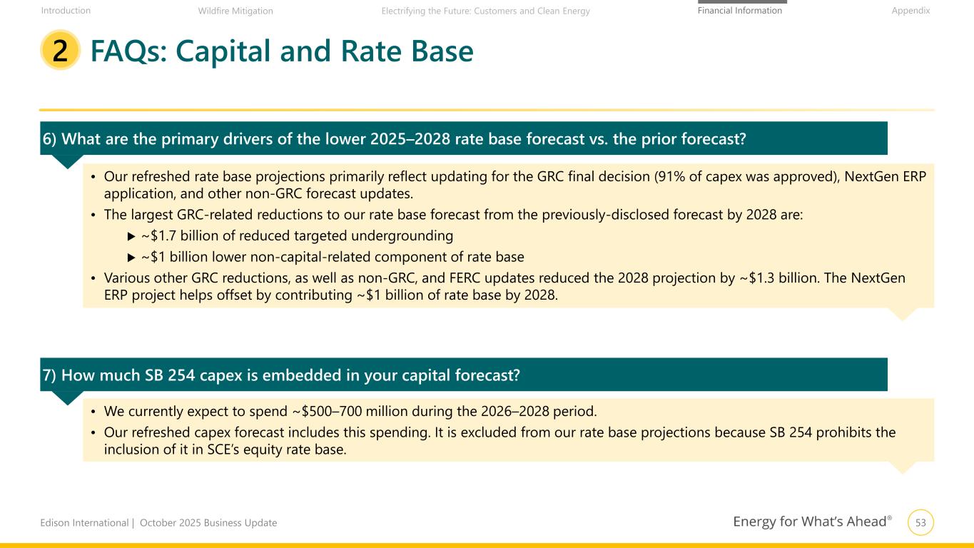 53Edison International | October 2025 Business Update Financial Information AppendixIntroduction Wildfire Mitigation Electrifying the Future: Customers and Clean Energy FAQs: Capital and Rate Base2 6) What are the primary drivers of the lower 2025–2028 rate base forecast vs. the prior forecast? • Our refreshed rate base projections primarily reflect updating for the GRC final decision (91% of capex was approved), NextGen ERP application, and other non-GRC forecast updates. • The largest GRC-related reductions to our rate base forecast from the previously-disclosed forecast by 2028 are:  ~$1.7 billion of reduced targeted undergrounding  ~$1 billion lower non-capital-related component of rate base • Various other GRC reductions, as well as non-GRC, and FERC updates reduced the 2028 projection by ~$1.3 billion. The NextGen ERP project helps offset by contributing ~$1 billion of rate base by 2028. 7) How much SB 254 capex is embedded in your capital forecast? • We currently expect to spend ~$500–700 million during the 2026–2028 period. • Our refreshed capex forecast includes this spending. It is excluded from our rate base projections because SB 254 prohibits the inclusion of it in SCE’s equity rate base.
