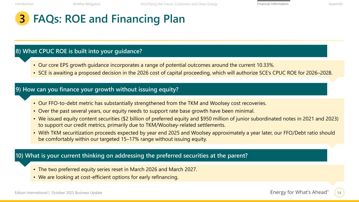 54Edison International | October 2025 Business Update Financial Information AppendixIntroduction Wildfire Mitigation Electrifying the Future: Customers and Clean Energy FAQs: ROE and Financing Plan3 9) How can you finance your growth without issuing equity? 10) What is your current thinking on addressing the preferred securities at the parent? • Our FFO-to-debt metric has substantially strengthened from the TKM and Woolsey cost recoveries. • Over the past several years, our equity needs to support rate base growth have been minimal. • We issued equity content securities ($2 billion of preferred equity and $950 million of junior subordinated notes in 2021 and 2023) to support our credit metrics, primarily due to TKM/Woolsey-related settlements. • With TKM securitization proceeds expected by year end 2025 and Woolsey approximately a year later, our FFO/Debt ratio should be comfortably within our targeted 15–17% range without issuing equity. • The two preferred equity series reset in March 2026 and March 2027. • We are looking at cost-efficient options for early refinancing. 8) What CPUC ROE is built into your guidance? • Our core EPS growth guidance incorporates a range of potential outcomes around the current 10.33%. • SCE is awaiting a proposed decision in the 2026 cost of capital proceeding, which will authorize SCE’s CPUC ROE for 2026–2028.