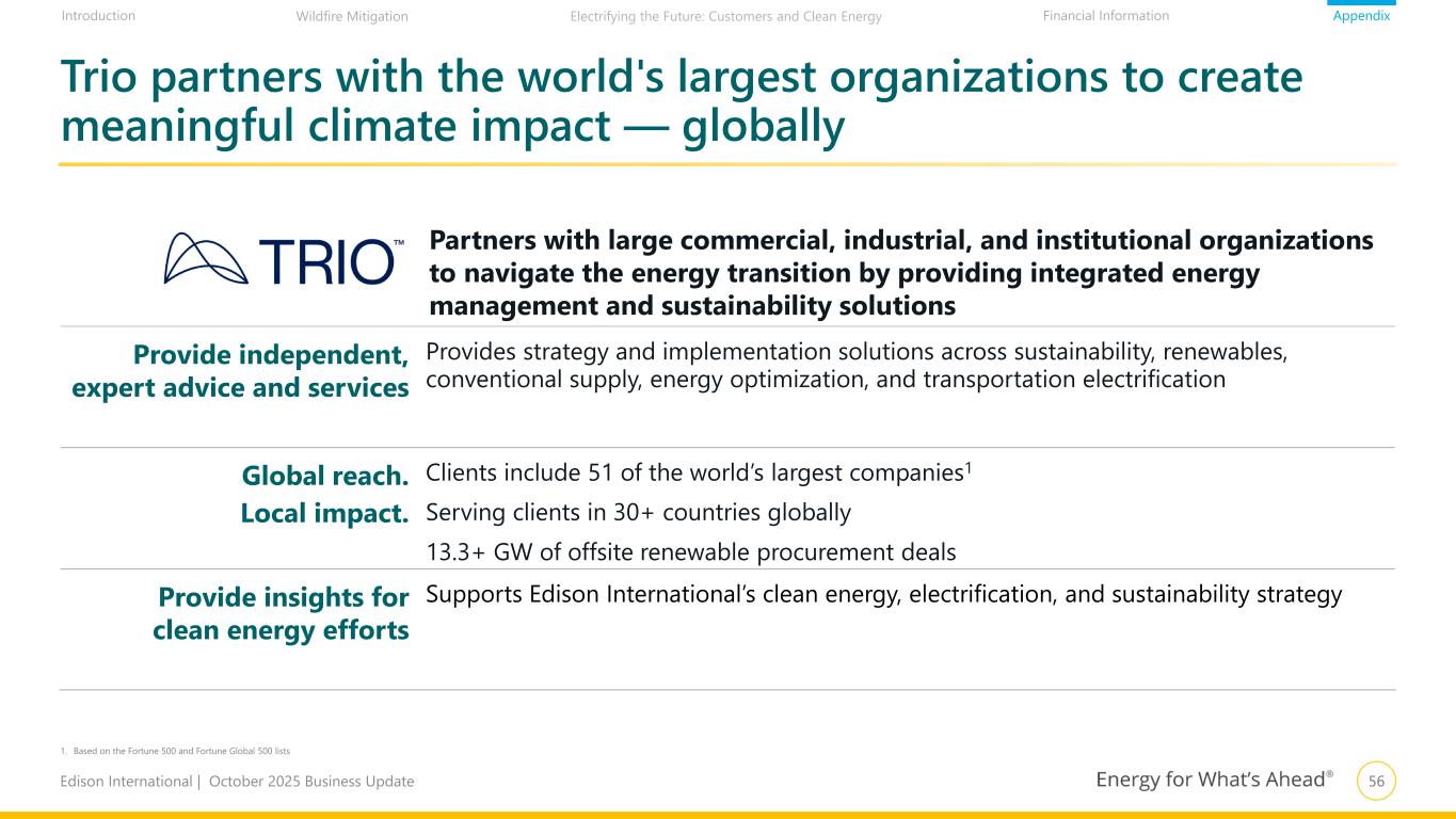 56Edison International | October 2025 Business Update AppendixIntroduction Financial InformationWildfire Mitigation Electrifying the Future: Customers and Clean Energy Partners with large commercial, industrial, and institutional organizations to navigate the energy transition by providing integrated energy management and sustainability solutions Provide independent, expert advice and services Provides strategy and implementation solutions across sustainability, renewables, conventional supply, energy optimization, and transportation electrification Global reach. Local impact. Clients include 51 of the world’s largest companies1 Serving clients in 30+ countries globally 13.3+ GW of offsite renewable procurement deals Provide insights for clean energy efforts Supports Edison International’s clean energy, electrification, and sustainability strategy Trio partners with the world's largest organizations to create meaningful climate impact — globally 1. Based on the Fortune 500 and Fortune Global 500 lists