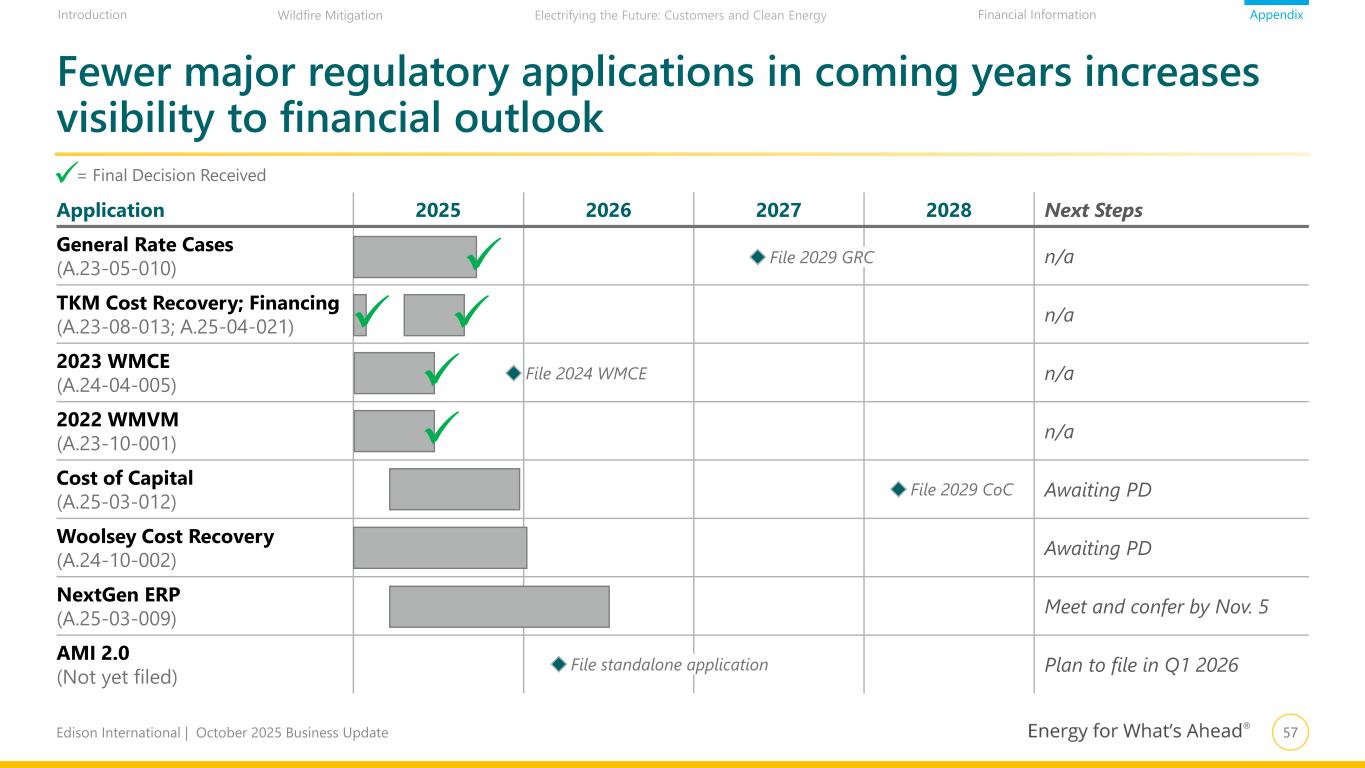 57Edison International | October 2025 Business Update AppendixIntroduction Financial InformationWildfire Mitigation Electrifying the Future: Customers and Clean Energy Fewer major regulatory applications in coming years increases visibility to financial outlook Application 2025 2026 2027 2028 Next Steps General Rate Cases (A.23-05-010) n/a TKM Cost Recovery; Financing (A.23-08-013; A.25-04-021) n/a 2023 WMCE (A.24-04-005) n/a 2022 WMVM (A.23-10-001) n/a Cost of Capital (A.25-03-012) Awaiting PD Woolsey Cost Recovery (A.24-10-002) Awaiting PD NextGen ERP (A.25-03-009) Meet and confer by Nov. 5 AMI 2.0 (Not yet filed) Plan to file in Q1 2026 = Final Decision Received      File 2029 GRC File 2029 CoC File standalone application File 2024 WMCE
