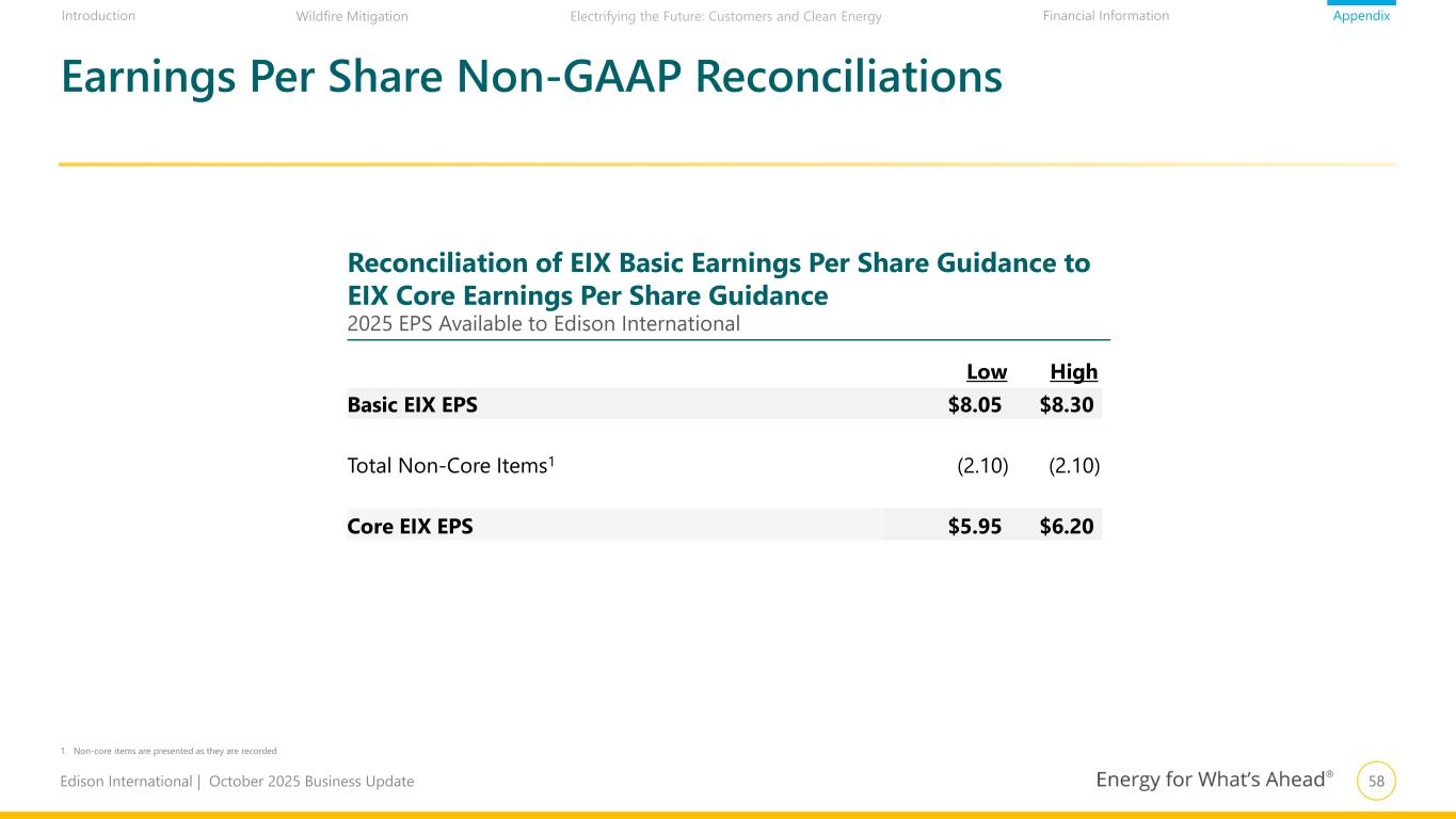 58Edison International | October 2025 Business Update AppendixIntroduction Financial InformationWildfire Mitigation Electrifying the Future: Customers and Clean Energy Low High Basic EIX EPS $8.05 $8.30 Total Non-Core Items1 (2.10) (2.10) Core EIX EPS $5.95 $6.20 1. Non-core items are presented as they are recorded Earnings Per Share Non-GAAP Reconciliations Reconciliation of EIX Basic Earnings Per Share Guidance to EIX Core Earnings Per Share Guidance 2025 EPS Available to Edison International