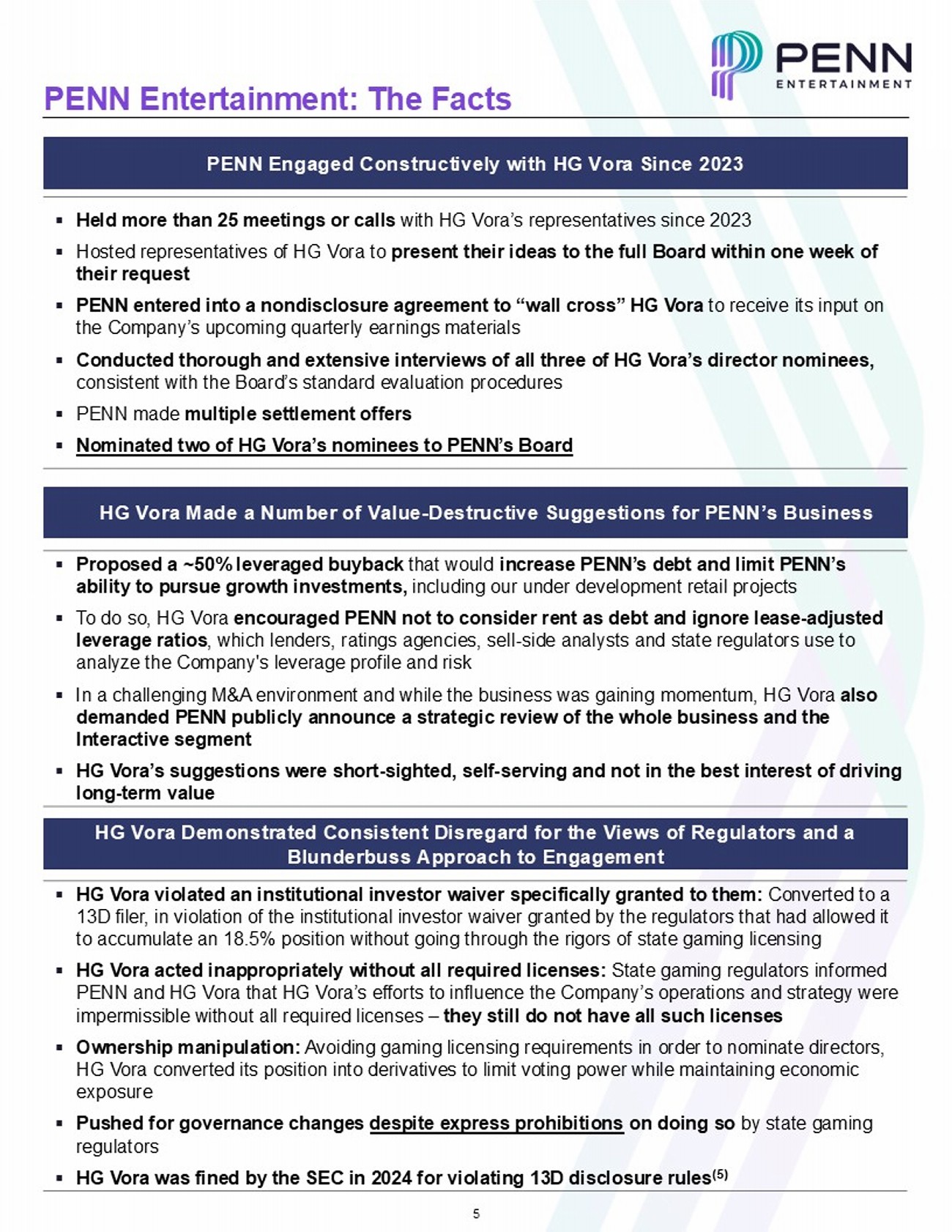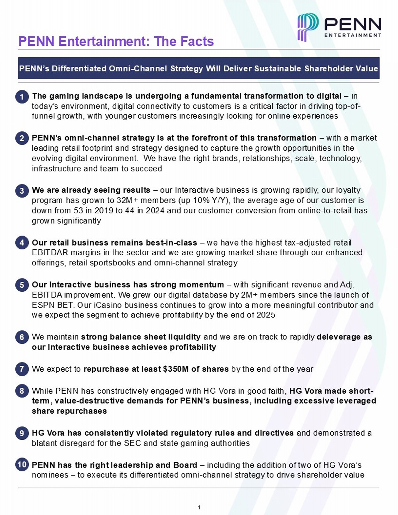 1 PENN Entertainment: The Facts PENN’s Differentiated Omni - Channel Strategy Will Deliver Sustainable Shareholder Value ▪ The gaming landscape is undergoing a fundamental transformation to digital – in today’s environment, digital connectivity to customers is a critical factor in driving top - of - funnel growth, with younger customers increasingly looking for online experiences ▪ PENN’s omni - channel strategy is at the forefront of this transformation – with a market leading retail footprint and strategy designed to capture the growth opportunities in the evolving digital environment. We have the right brands, relationships, scale, technology, infrastructure and team to succeed ▪ We are already seeing results – our Interactive business is growing rapidly, our loyalty program has grown to 32M+ members (up 10% Y/Y), the average age of our customer is down from 53 in 2019 to 44 in 2024 and our customer conversion from online - to - retail has grown significantly ▪ Our retail business remains best - in - class – w e have the highest tax - adjusted retail EBITDAR margins in the sector and we are growing market share through our enhanced offerings, retail sportsbooks and omni - channel strategy ▪ Our Interactive business has strong momentum – with significant revenue and Adj. EBITDA improvement. We grew our digital database by 2M+ members since the launch of ESPN BET. Our iCasino business continues to grow into a more meaningful contributor and we expect the segment to achieve profitability by the end of 2025 ▪ We maintain strong balance sheet liquidity and we are on track to rapidly deleverage as our Interactive business achieves profitability ▪ We expect to repurchase at least $350M of shares by the end of the year ▪ While PENN has constructively engaged with HG Vora in good faith, HG Vora made short - term, value - destructive demands for PENN’s business, including excessive leveraged share repurchases ▪ HG Vora has consistently violated regulatory rules and directives and demonstrated a blatant disregard for the SEC and state gaming authorities ▪ PENN has the right leadership and Board – including the addition of two of HG Vora’s nominees – to execute its differentiated omni - channel strategy to drive shareholder value 1 2 3 4 5 6 7 8 9 10