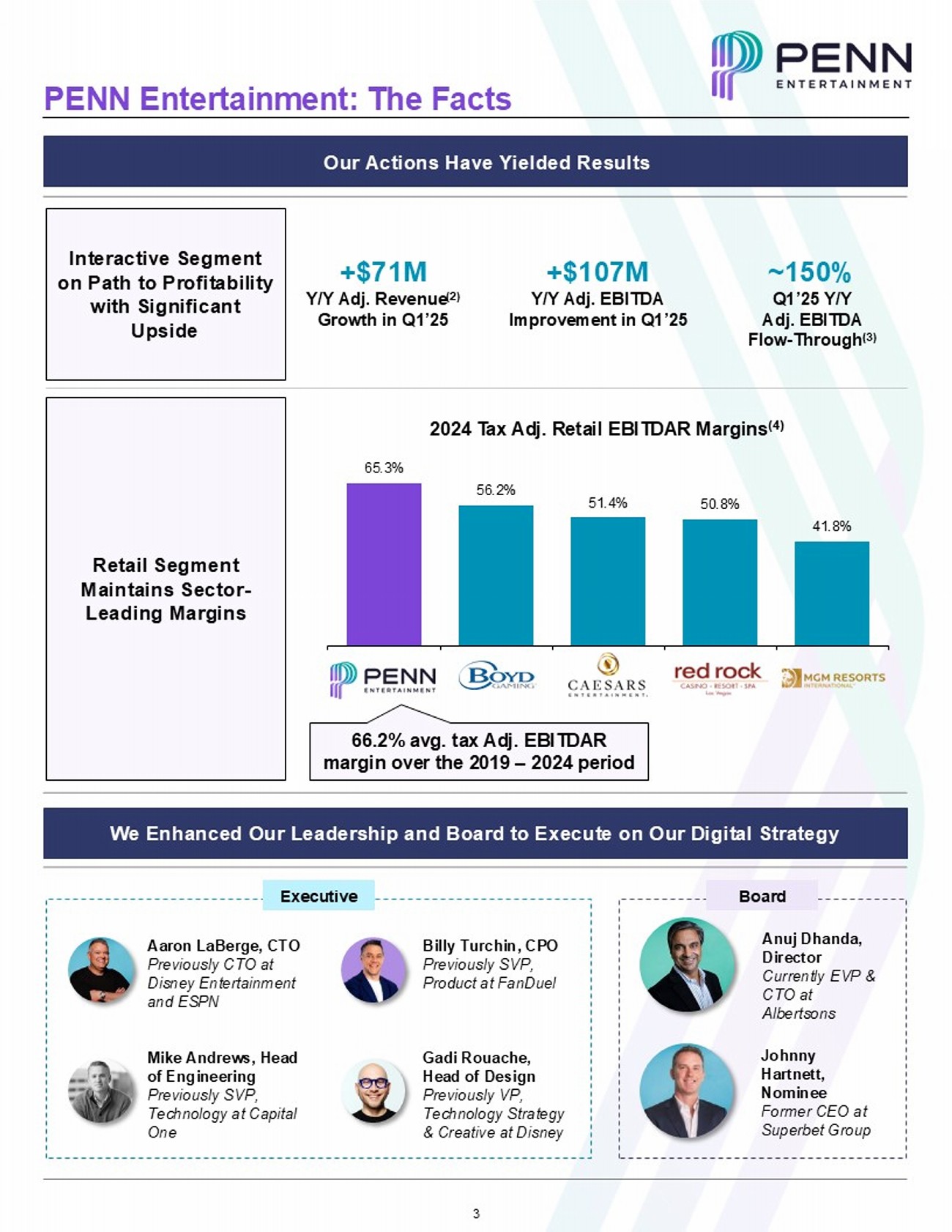2 PENN Entertainment: The Facts The Current Gaming Landscape Is Rapidly Undergoing a Structural Shift to Digital Our Omni - Channel Strategy Is at the Forefront of This Transformation and We Are Positioned to Win 42 Properties Across 19 States 5 New Developments Coming Online Retail Operator with Unrivaled Scale Growing Interactive Segment Attracting a Younger Customer Attracting Online Customers Near Retail Locations Average Age of Our 12 - Month Active Database 34% of Digitally - Acquired Customers Within 50 Miles of a Property 53 44 2019 2024 Growing Loyalty Program Growing Retail Market Share 32M+ Loyalty Program Members as of YE ‘24 +10% Y/Y 14 of 17 Regional Markets with No New Supply Saw Market Share Growth in Q1’25 ▪ Online gaming is expected to generate 33% of gaming revenue by 2030 vs. just 19% today (1) ▪ OSB and iCasino GGR is projected to grow at a ~17% CAGR from 2024 to 2030, as compared to land - based revenue, which is projected to grow at a ~3% CAGR over the same period (1) “ These past few years have reshaped the industry , and the revenue pie, while it's much bigger, looks very different than it used to. That's increasingly driven by new online gaming options available to more people than ever before.” – February 2025 “Across the 492 commercial casinos around the country, revenue from traditional casino games grew by one percent in 2024 to a record $ 49 . 89 billion . Legal sports betting launched in North Carolina and Vermont in 2024 , helping drive commercial sports betting revenue up 24 . 8 percent to $ 13 . 78 billion as Americans legally bet a total of $ 149 . 90 billion on sports throughout the year . The iGaming market also continued its strong growth in 2024 , with combined iGaming revenue from seven active states (excluding Nevada’s online poker only market) reaching $ 8 . 41 billion, a 28 . 7 percent increase year - over - year . ” – May 2025 Digital Database Has Grown by 2M+ Members Since the Launch of ESPN BET