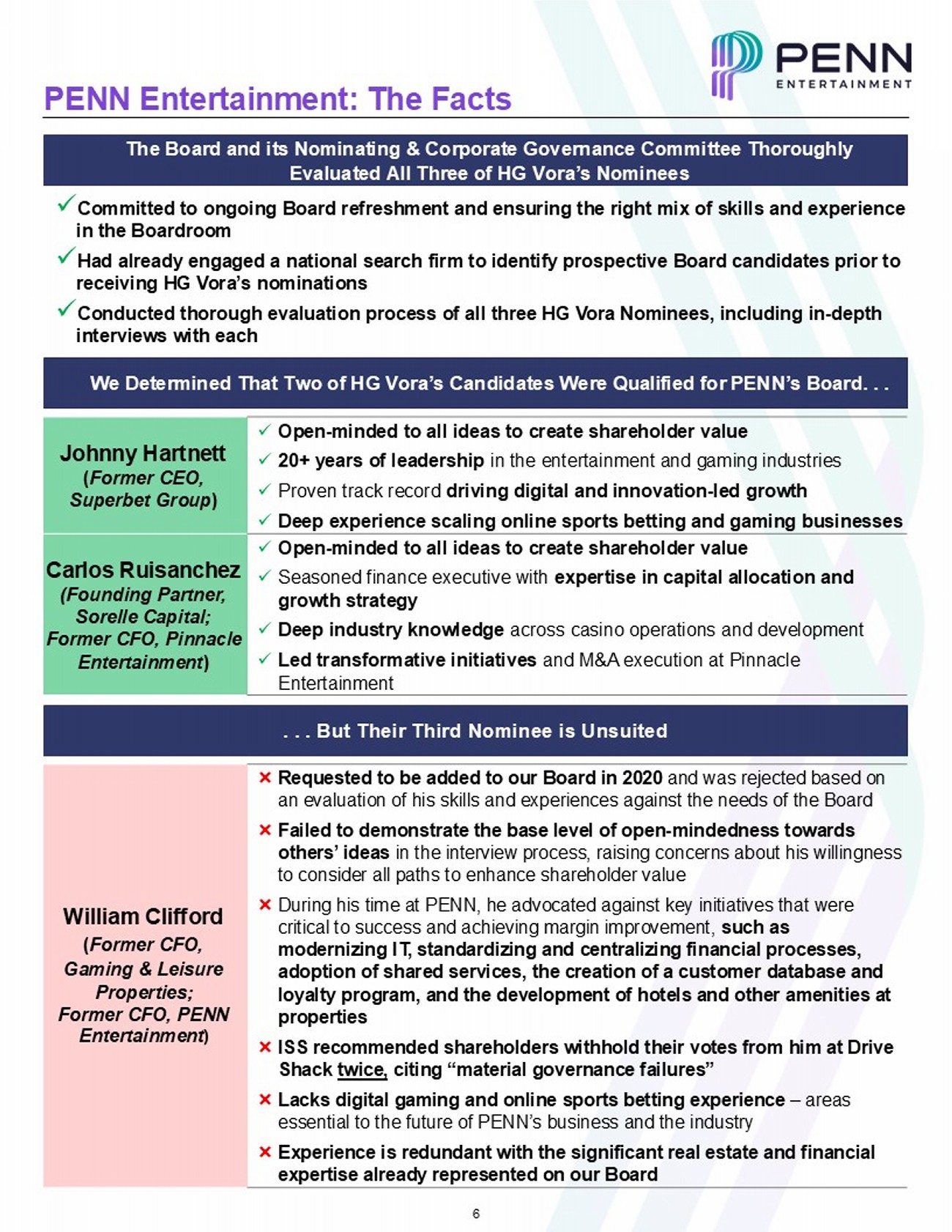 5 ▪ Held more than 25 meetings or calls with HG Vora’s representatives since 2023 ▪ Hosted representatives of HG Vora to present their ideas to the full Board within one week of their request ▪ PENN entered into a nondisclosure agreement to “wall cross” HG Vora to receive its input on the Company’s upcoming quarterly earnings materials ▪ Conducted thorough and extensive interviews of all three of HG Vora’s director nominees, consistent with the Board’s standard evaluation procedures ▪ PENN made multiple settlement offers ▪ Nominated two of HG Vora’s nominees to PENN’s Board PENN Entertainment: The Facts PENN Engaged Constructively with HG Vora Since 2023 ▪ Proposed a ~50% leveraged buyback that would increase PENN’s debt and limit PENN’s ability to pursue growth investments, including our under development retail projects ▪ To do so, HG Vora encouraged PENN to ignore lease - adjusted leverage ratios , which lenders, ratings agencies, sell - side analysts and state regulators use to analyze the Company's leverage profile and risk ▪ In a challenging M&A environment and while the business was gaining momentum, HG Vora also demanded PENN publicly announce a strategic review of the whole business and the Interactive segment ▪ HG Vora’s suggestions were short - sighted, self - serving and not in the best interest of driving long - term value HG Vora Made a Number of Value - Destructive Suggestions for PENN’s Business ▪ HG Vora violated an institutional investor waiver specifically granted to them: Converted to a 13D filer, in violation of the institutional investor waiver granted by the regulators that had allowed it to accumulate an 18.5% position without going through the rigors of state gaming licensing ▪ HG Vora acted inappropriately without all required licenses: State gaming regulators informed PENN and HG Vora that HG Vora’s efforts to influence the Company’s operations and strategy were impermissible without all required licenses – they still do not have all such licenses ▪ Ownership manipulation: Avoiding gaming licensing requirements in order to nominate directors, HG Vora converted its position into derivatives to limit voting power while maintaining economic exposure ▪ Pushed for governance changes despite express prohibitions on doing so by state gaming regulators ▪ HG Vora was fined by the SEC in 2024 for violating 13D disclosure rules (5) HG Vora Demonstrated Consistent Disregard for the Views of Regulators and a Blunderbuss Approach to Engagement
