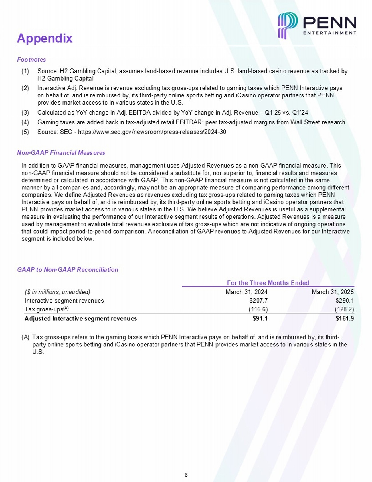 8 Appendix Footnotes (1) Source: H2 Gambling Capital; assumes land - based revenue includes U.S. land - based casino revenue as tracked by H2 Gambling Capital (2) Interactive Adj. Revenue is revenue excluding tax gross - ups related to gaming taxes which PENN Interactive pays on behalf of, and is reimbursed by, its third - party online sports betting and iCasino operator partners that PENN provides market access to in various states in the U.S. (3) Calculated as YoY change in Adj. EBITDA divided by YoY change in Adj. Revenue – Q1’25 vs. Q1’24 (4) Gaming taxes are added back in tax - adjusted retail EBITDAR; peer tax - adjusted margins from Wall Street research (5) Source: SEC - https://www.sec.gov/newsroom/press - releases/2024 - 30 Non - GAAP Financial Measures In addition to GAAP financial measures, management uses Adjusted Revenues as a non - GAAP financial measure. This non - GAAP financial measure should not be considered a substitute for, nor superior to, financial results and measures determined or calculated in accordance with GAAP. This non - GAAP financial measure is not calculated in the same manner by all companies and, accordingly, may not be an appropriate measure of comparing performance among different companies. We define Adjusted Revenues as revenues excluding tax gross - ups related to gaming taxes which PENN Interactive pays on behalf of, and is reimbursed by, its third - party online sports betting and iCasino operator partners that PENN provides market access to in various states in the U.S. We believe Adjusted Revenues is useful as a supplemental measure in evaluating the performance of our Interactive segment results of operations. Adjusted Revenues is a measure used by management to evaluate total revenues exclusive of tax gross - ups which are not indicative of ongoing operations that could impact period - to - period comparison. A reconciliation of GAAP revenues to Adjusted Revenues for our Interactive segment is included below. GAAP to Non - GAAP Reconciliation For the Three Months Ended March 31, 2025 March 31, 2024 ($ in millions, unaudited) $290.1 $207.7 Interactive segment revenues (128.2) (116.6) Tax gross - ups (A) $161.9 $91.1 Adjusted Interactive segment revenues (A) Tax gross - ups refers to the gaming taxes which PENN Interactive pays on behalf of, and is reimbursed by, its third - party online sports betting and iCasino operator partners that PENN provides market access to in various states in the U.S.