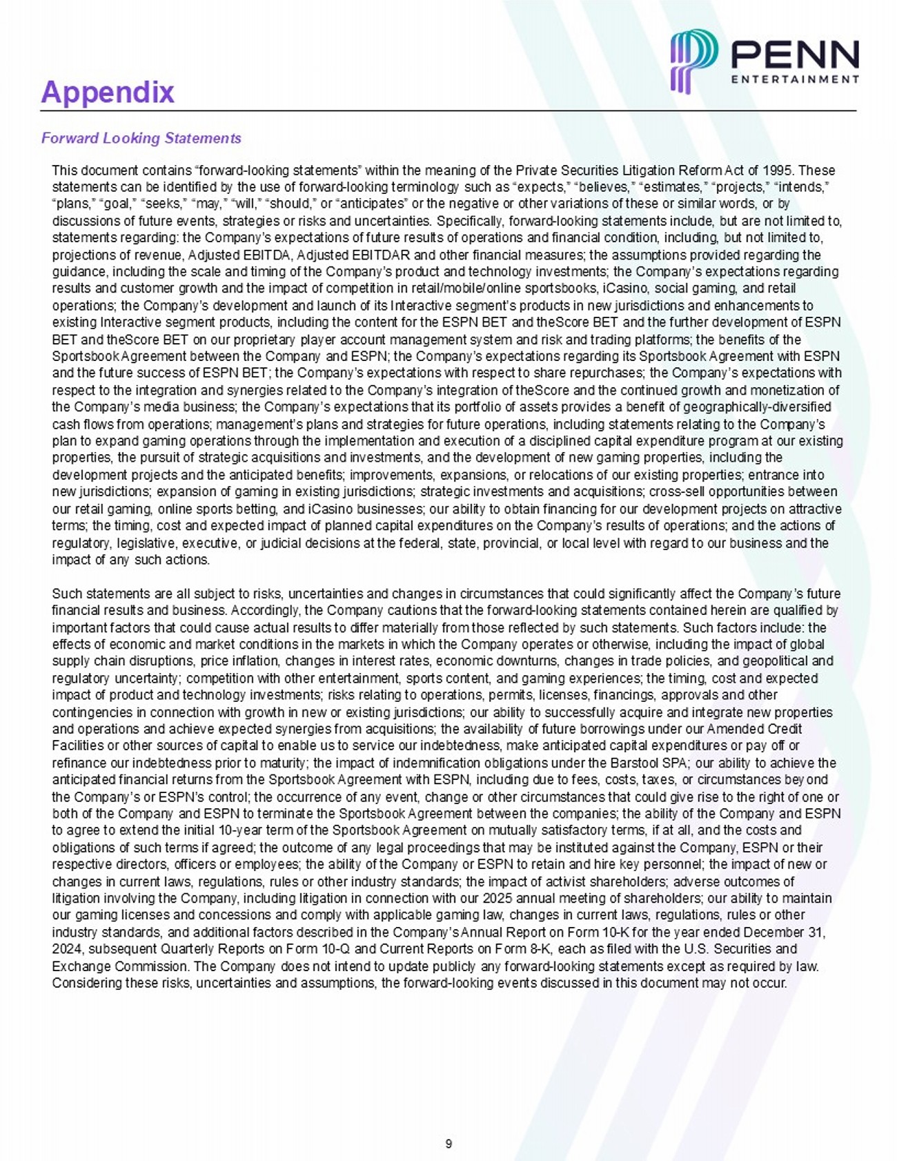 9 Appendix Forward Looking Statements This document contains “forward - looking statements” within the meaning of the Private Securities Litigation Reform Act of 1995. These statements can be identified by the use of forward - looking terminology such as “expects,” “believes,” “estimates,” “projects,” “ intends,” “plans,” “goal,” “seeks,” “may,” “will,” “should,” or “anticipates” or the negative or other variations of these or similar w ord s, or by discussions of future events, strategies or risks and uncertainties. Specifically, forward - looking statements include, but are n ot limited to, statements regarding: the Company’s expectations of future results of operations and financial condition, including, but not lim ited to, projections of revenue, Adjusted EBITDA, Adjusted EBITDAR and other financial measures; the assumptions provided regarding th e guidance, including the scale and timing of the Company’s product and technology investments; the Company’s expectations rega rdi ng results and customer growth and the impact of competition in retail/mobile/online sportsbooks, iCasino, social gaming, and re tai l operations; the Company’s development and launch of its Interactive segment’s products in new jurisdictions and enhancements to existing Interactive segment products, including the content for the ESPN BET and theScore BET and the further development of ES PN BET and theScore BET on our proprietary player account management system and risk and trading platforms; the benefits of the Sportsbook Agreement between the Company and ESPN; the Company’s expectations regarding its Sportsbook Agreement with ESPN and the future success of ESPN BET; the Company’s expectations with respect to share repurchases; the Company’s expectations wit h respect to the integration and synergies related to the Company’s integration of theScore and the continued growth and moneti zat ion of the Company’s media business; the Company’s expectations that its portfolio of assets provides a benefit of geographically - diver sified cash flows from operations; management’s plans and strategies for future operations, including statements relating to the Com pan y’s plan to expand gaming operations through the implementation and execution of a disciplined capital expenditure program at our ex isting properties, the pursuit of strategic acquisitions and investments, and the development of new gaming properties, including th e development projects and the anticipated benefits; improvements, expansions, or relocations of our existing properties; entra nce into new jurisdictions; expansion of gaming in existing jurisdictions; strategic investments and acquisitions; cross - sell opportuniti es between our retail gaming, online sports betting, and iCasino businesses; our ability to obtain financing for our development project s o n attractive terms; the timing, cost and expected impact of planned capital expenditures on the Company’s results of operations; and the a cti ons of regulatory, legislative, executive, or judicial decisions at the federal, state, provincial, or local level with regard to ou r b usiness and the impact of any such actions. Such statements are all subject to risks, uncertainties and changes in circumstances that could significantly affect the Comp any ’s future financial results and business. Accordingly, the Company cautions that the forward - looking statements contained herein are quali fied by important factors that could cause actual results to differ materially from those reflected by such statements. Such factors inc lude: the effects of economic and market conditions in the markets in which the Company operates or otherwise, including the impact of glo bal supply chain disruptions, price inflation, changes in interest rates, economic downturns, changes in trade policies, and geop oli tical and regulatory uncertainty; competition with other entertainment, sports content, and gaming experiences; the timing, cost and ex pec ted impact of product and technology investments; risks relating to operations, permits, licenses, financings, approvals and othe r contingencies in connection with growth in new or existing jurisdictions; our ability to successfully acquire and integrate n ew properties and operations and achieve expected synergies from acquisitions; the availability of future borrowings under our Amended Cred it Facilities or other sources of capital to enable us to service our indebtedness, make anticipated capital expenditures or pay of f or refinance our indebtedness prior to maturity; the impact of indemnification obligations under the Barstool SPA; our ability t o a chieve the anticipated financial returns from the Sportsbook Agreement with ESPN, including due to fees, costs, taxes, or circumstances bey ond the Company’s or ESPN’s control; the occurrence of any event, change or other circumstances that could give rise to the right of one or both of the Company and ESPN to terminate the Sportsbook Agreement between the companies; the ability of the Company and ESPN to agree to extend the initial 10 - year term of the Sportsbook Agreement on mutually satisfactory terms, if at all, and the costs and obligations of such terms if agreed; the outcome of any legal proceedings that may be instituted against the Company, ESPN or th eir respective directors, officers or employees; the ability of the Company or ESPN to retain and hire key personnel; the impact of new or changes in current laws, regulations, rules or other industry standards; the impact of activist shareholders; adverse outcome s o f litigation involving the Company, including litigation in connection with our 2025 annual meeting of shareholders; our abilit y t o maintain our gaming licenses and concessions and comply with applicable gaming law, changes in current laws, regulations, rules or oth er industry standards, and additional factors 