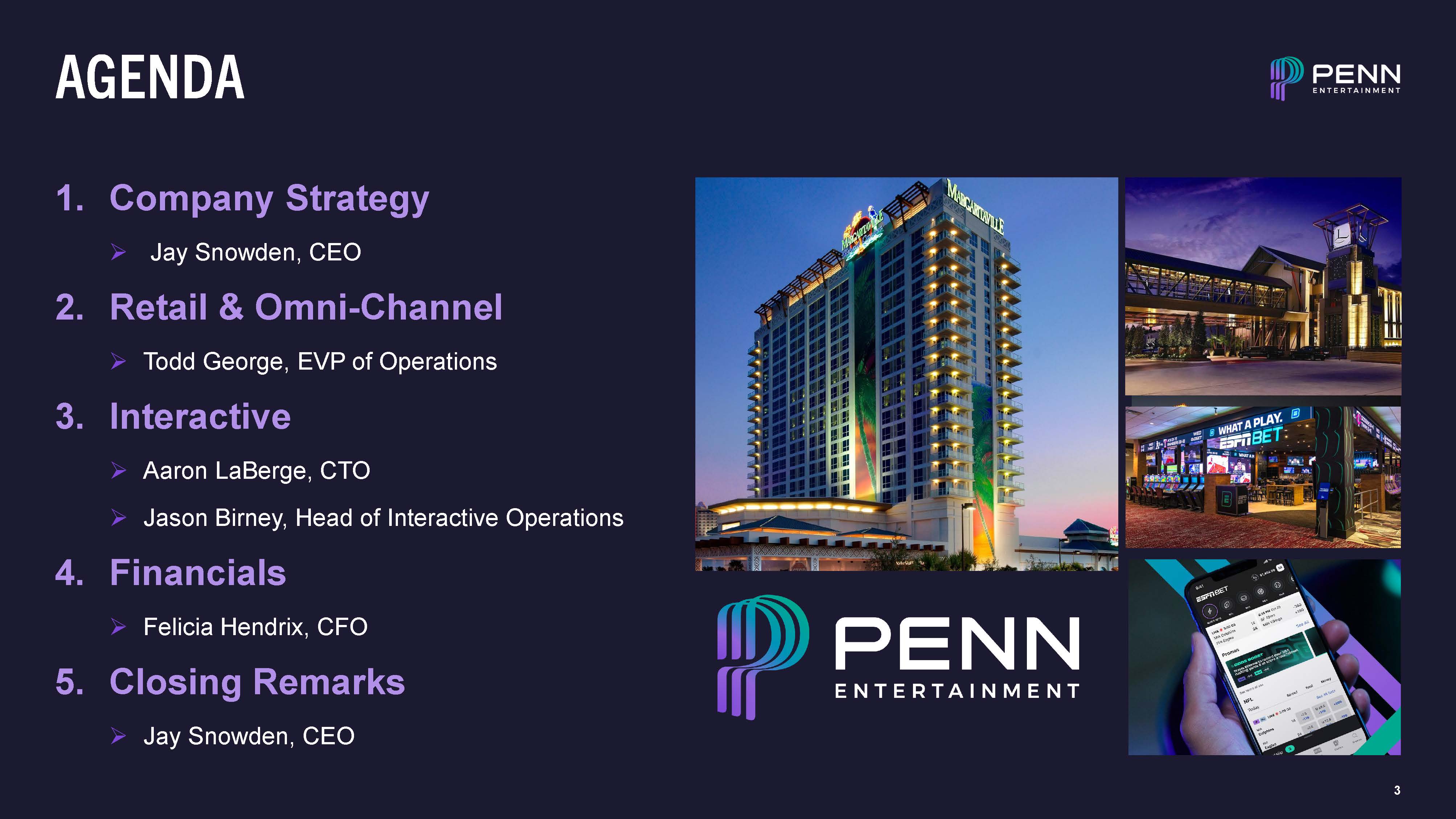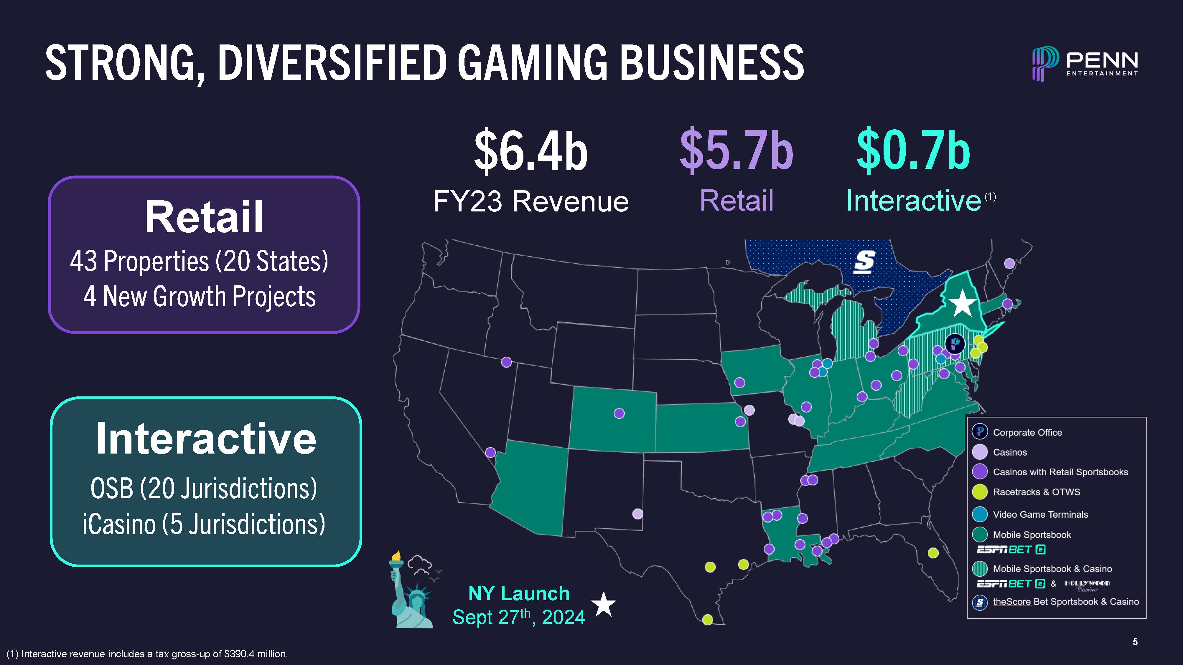 FORWARD-LOOKING STATEMENTS  4  This presentation contains “forward-looking statements” within the meaning of the Private Securities Litigation Reform Act of 1995. These statements can be identified by the use of forward-looking terminology such as “expects,” “believes,” “estimates,” “projects,” “intends,” “plans,” “goal,” “seeks,” “may,” “will,” “should,” “looking ahead,” “vision,” “outlook,” “guidance,” “upside” or “anticipates” or the negative or other variations of these or similar words, as applicable, or by discussions of future events, strategies or risks and uncertainties. Specifically, forward-looking statements include, but are not limited to, statements regarding: the Company’s expectations of future results of operations and financial condition, including future revenue and Adjusted EBITDAR and EBITDA and other financial guidance; the assumptions provided regarding the guidance, including the scale and timing of the Company’s product and technology investments; the Company’s expectations regarding results and customer growth, retention and spend; the impact of competition, in retail/mobile/online sportsbooks, iCasino, social gaming, and retail operations; the Company’s development and launch of its Interactive segment’s products in new jurisdictions and enhancements to existing Interactive segment products, including products and content for ESPN BET and theScore Bet, and the anticipated benefits thereof; the benefits of the Sportsbook Agreement between the Company and ESPN; the Company’s expectations regarding its Sportsbook Agreement with ESPN and the future success of ESPN BET; the Company’s expectations with respect to the integration and synergies related to the Company’s integration of theScore and the continued growth and monetization of the Company’s media business; the Company’s expectations that its portfolio of assets provides a benefit of geographically-diversified cash flows from operations; the Company’s plan to expand gaming operations through the implementation and execution of a disciplined capital expenditure program at our existing properties, the pursuit of strategic acquisitions and investments, and the development of new gaming properties, including the development projects; improvements, expansions, or relocations of our existing properties; entrance into new jurisdictions; expansion of gaming in existing jurisdictions; strategic investments and acquisitions; cross-sell opportunities between our retail gaming, online sports betting, and iCasino businesses; our ability to obtain financing for our development projects on attractive terms; the timing, cost and expected impact of planned capital expenditures on the Company’s results of operations; and the actions of regulatory, legislative, executive, or judicial decisions at the federal, state, provincial, or local level with regard to our business and the impact of any such actions.  Such statements are all subject to risks, uncertainties and changes in circumstances that could significantly affect the Company’s future financial results and business. Accordingly, the Company cautions that forward looking statements contained herein are qualified by important factors that could cause actual results to differ materially from those reflected by such statements. Such factors include: the effects of economic and market conditions in the markets in which the Company operates or otherwise, including the impact of global supply chain disruptions, price inflation, rising interest rates, slowing economic growth, and geopolitical uncertainty; competition with other entertainment, sports content, and gaming experiences; the timing, cost and expected impact of product and technology investments; risks relating to operations, permits, licenses, financings, approvals and other contingencies in connection with growth in new or existing jurisdictions; our ability to achieve the anticipated financial returns from the Sportsbook Agreement with ESPN, including due to fees, costs, taxes or circumstances beyond the Company’s or ESPN’s control; the timing, cost and expected impact of product and technology investments; the ability of the Company or ESPN to retain and hire key personnel; our ability to successfully acquire and integrate new properties and operations; our ability to maintain our gaming licenses and concessions and comply with applicable gaming law, current laws, rules or other industry standards, and additional risks and uncertainties described in the Company’s Annual Report on Form 10-K for the year ended December 31, 2023, subsequent Quarterly Reports on Form 10-Q and Current Reports on Form 8-K, each as filed with the U.S. Securities and Exchange Commission. The Company does not intend to update publicly any forward-looking statements except as required by law. Considering these risks, uncertainties and assumptions, the forward-looking events discussed in this presentation may not occur.  This presentation may contain trademarks, service marks, trade names and copyrights of other companies or entities, which are the property of their respective owners. Solely for convenience, some of the trademarks, service marks, trade names and copyrights referred to in this presentation may be listed without the TM, SM © or ® symbols, but we will assert, to the fullest extent under applicable law, the rights of the applicable owners, if any, to these trademarks, service marks, trade names and copyrights.  The third quarter 2024 estimates and guidance provided in this presentation are estimates based on information available to management as of the date of this presentation, are subject to change and are not a guarantee of future performance. The Company’s financial closing procedures for the third quarter 2024 are not yet complete. It is possible that the final results for the third quarter may vary from thes