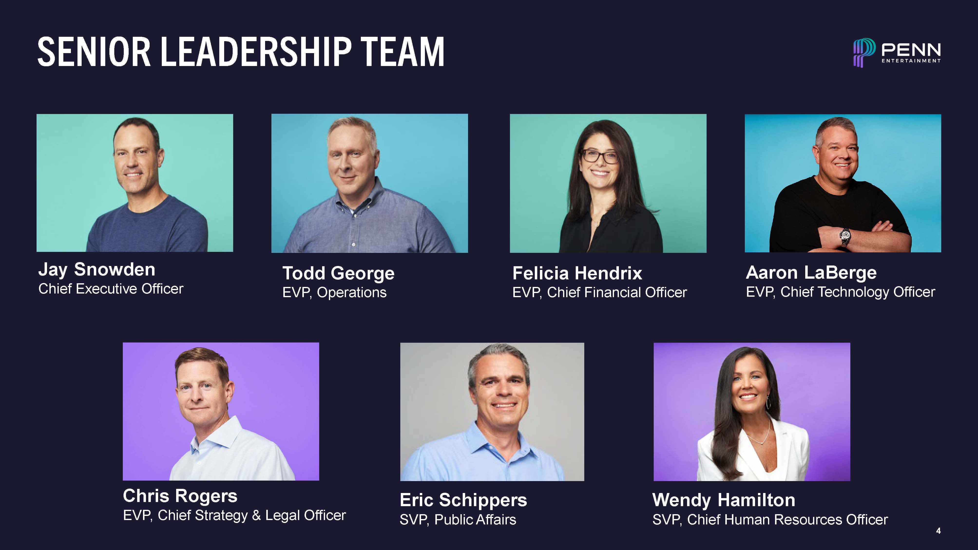 SENIOR LEADERSHIP TEAM  Jay Snowden  Chief Executive Officer  Todd George  EVP, Operations  Felicia Hendrix  EVP, Chief Financial Officer  Aaron LaBerge  EVP, Chief Technology Officer  Chris Rogers  EVP, Chief Strategy & Legal Officer  Wendy Hamilton  SVP, Chief Human Resources Officer  Eric Schippers  SVP, Public Affairs  4
