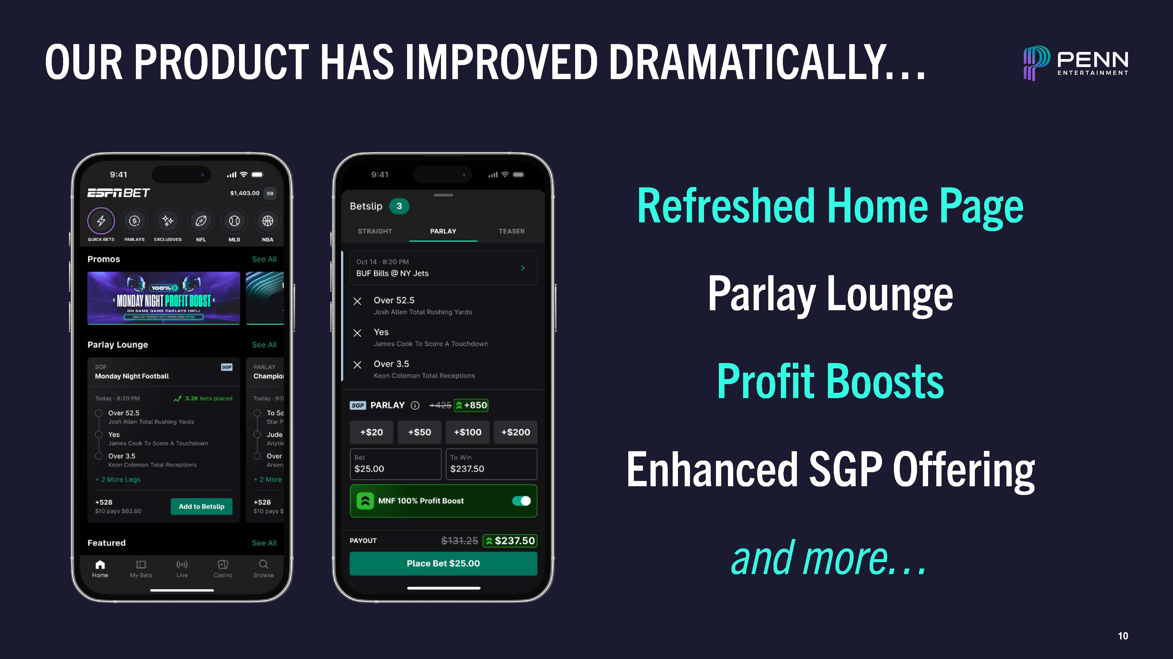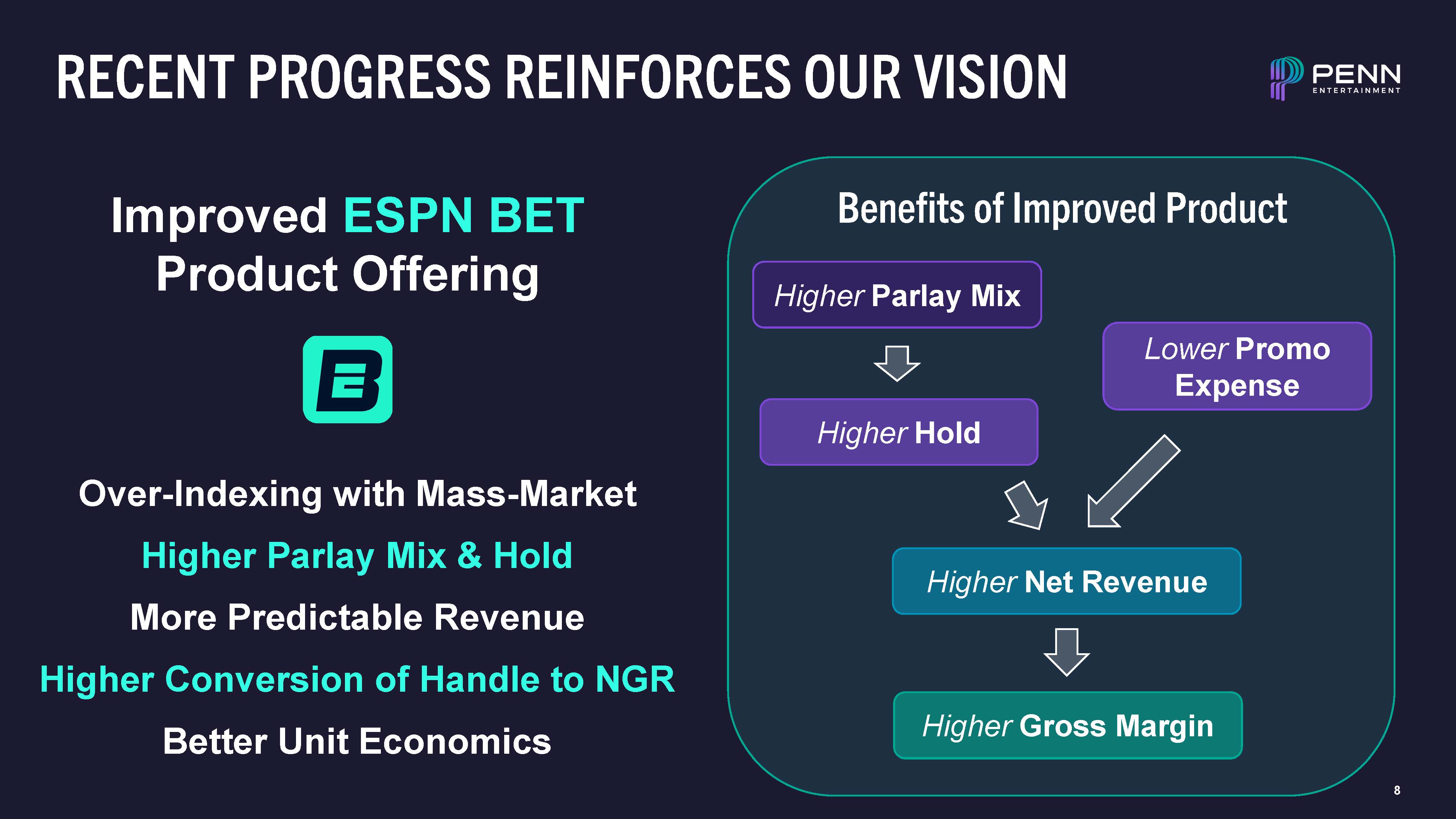 RECENT PROGRESS REINFORCES OUR VISION  Higher Parlay Mix  Higher Net Revenue  Higher Gross Margin  Lower Promo Expense  Higher Hold  Over-Indexing with Mass-Market  Higher Parlay Mix & Hold More Predictable Revenue  Higher Conversion of Handle to NGR Better Unit Economics  Improved ESPN BET Product Offering  Benefits of Improved Product  6