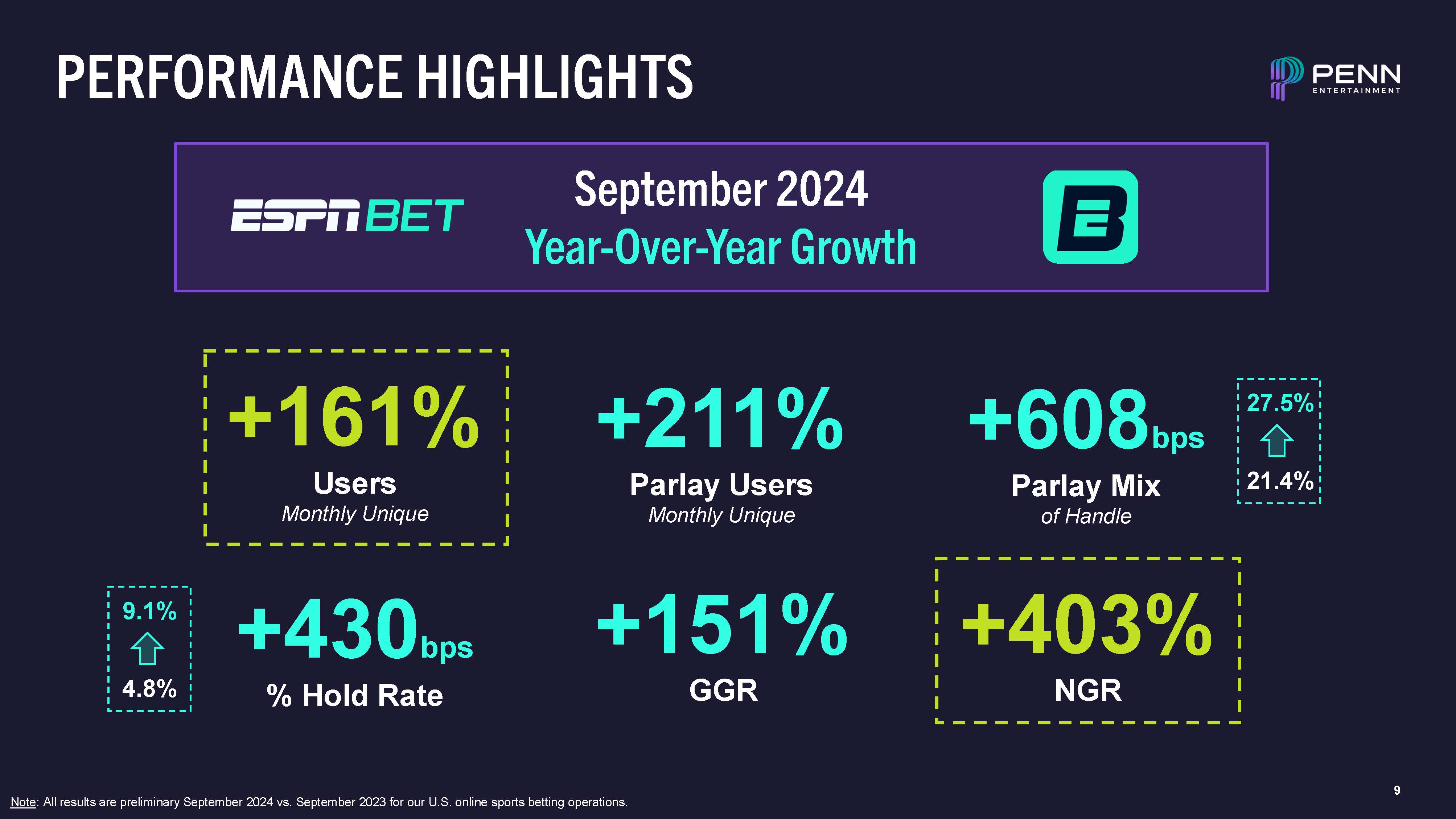 9  +403%  NGR  +161%  Users  Monthly Unique  PERFORMANCE HIGHLIGHTS  +211%  Parlay Users  Monthly Unique  +608bps  Parlay Mix  of Handle  +430bps  % Hold Rate  September 2024  Year-Over-Year Growth  +151%  GGR  27.5%  21.4%  9.1%  4.8%  Note: All results are preliminary September 2024 vs. September 2023 for our U.S. online sports betting operations.