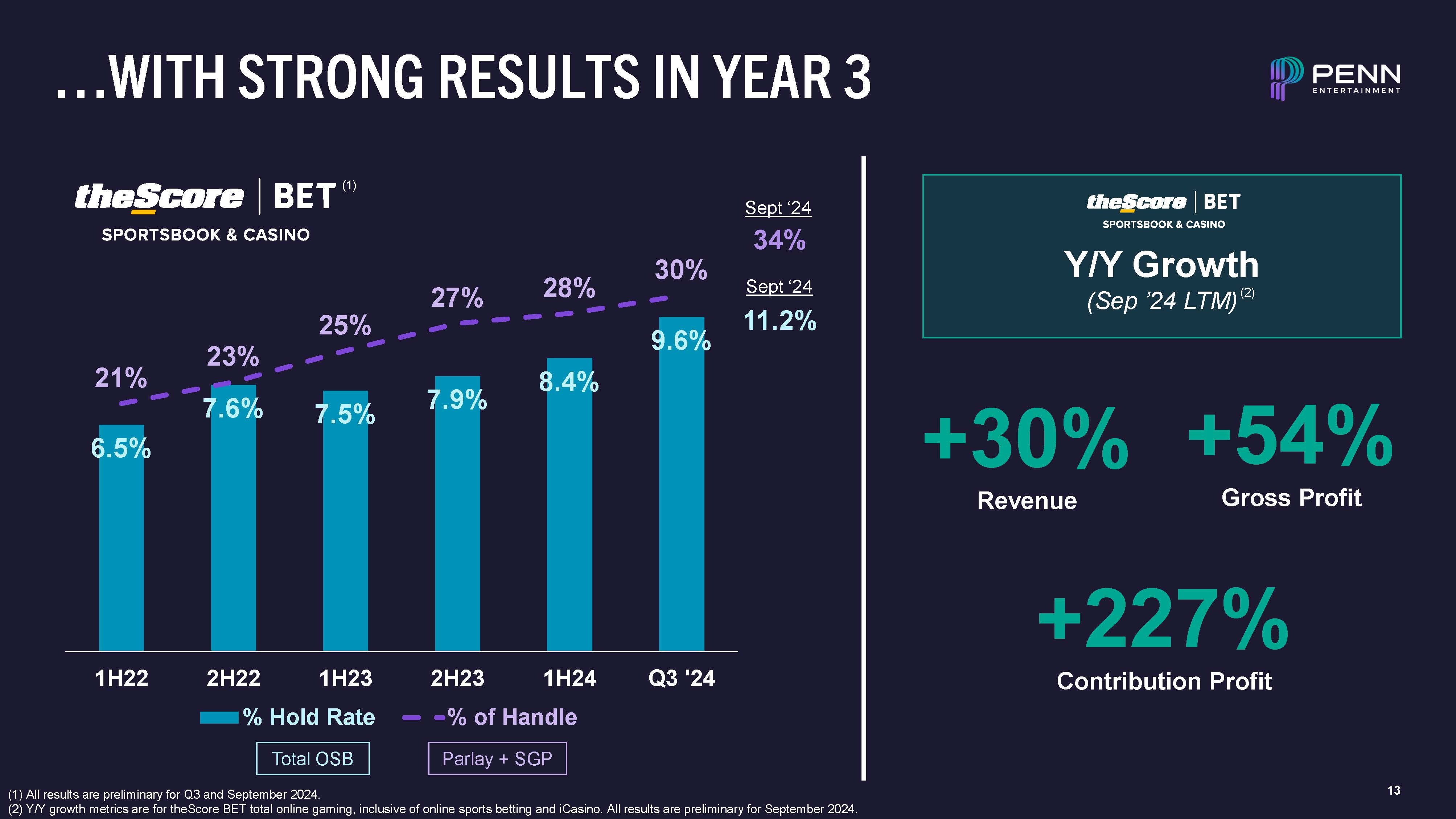 13  6.5%  7.6%  7.5%  7.9%  8.4%  9.6%  21%  23%  25%  27%  28%  30%  1H22  Q3 '24  2H22 1H23  % Hold Rate  2H23 1H24  % of Handle  …WITH STRONG RESULTS IN YEAR 3  Parlay + SGP  Sept ‘24  34%  Sept ‘24  11.2%  Revenue  +30% +54%  Gross Profit  +227%  Contribution Profit  Total OSB  Y/Y Growth  (Sep ’24 LTM) (2)  All results are preliminary for Q3 and September 2024.  Y/Y growth metrics are for theScore BET total online gaming, inclusive of online sports betting and iCasino. All results are preliminary for September 2024.  (1)