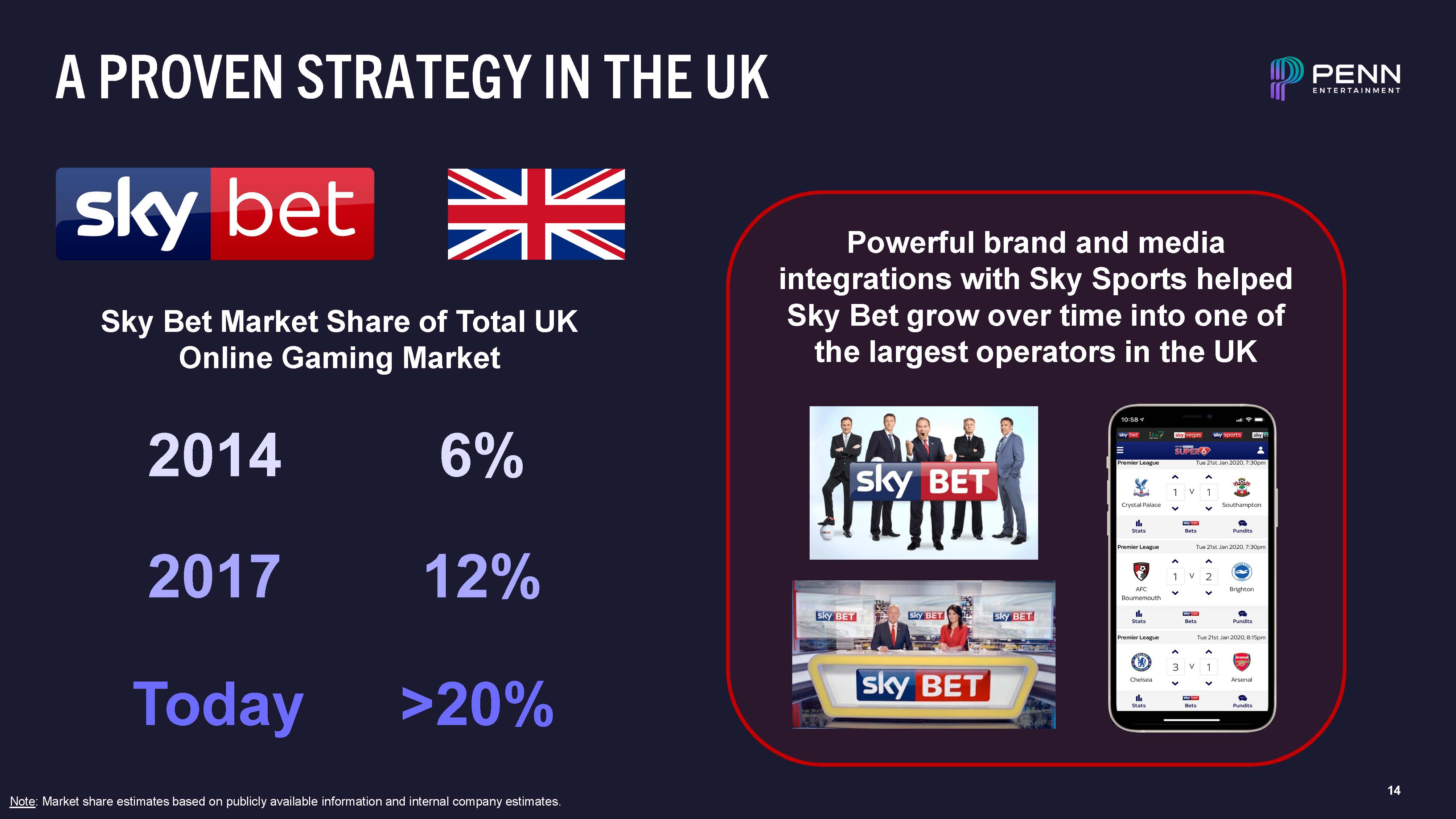 14  A PROVEN STRATEGY IN THE UK  Powerful brand and media integrations with Sky Sports helped Sky Bet grow over time into one of the largest operators in the UK  2014  2017  6%  12%  Sky Bet Market Share of Total UK Online Gaming Market  Today >20%  Note: Market share estimates based on publicly available information and internal company estimates.