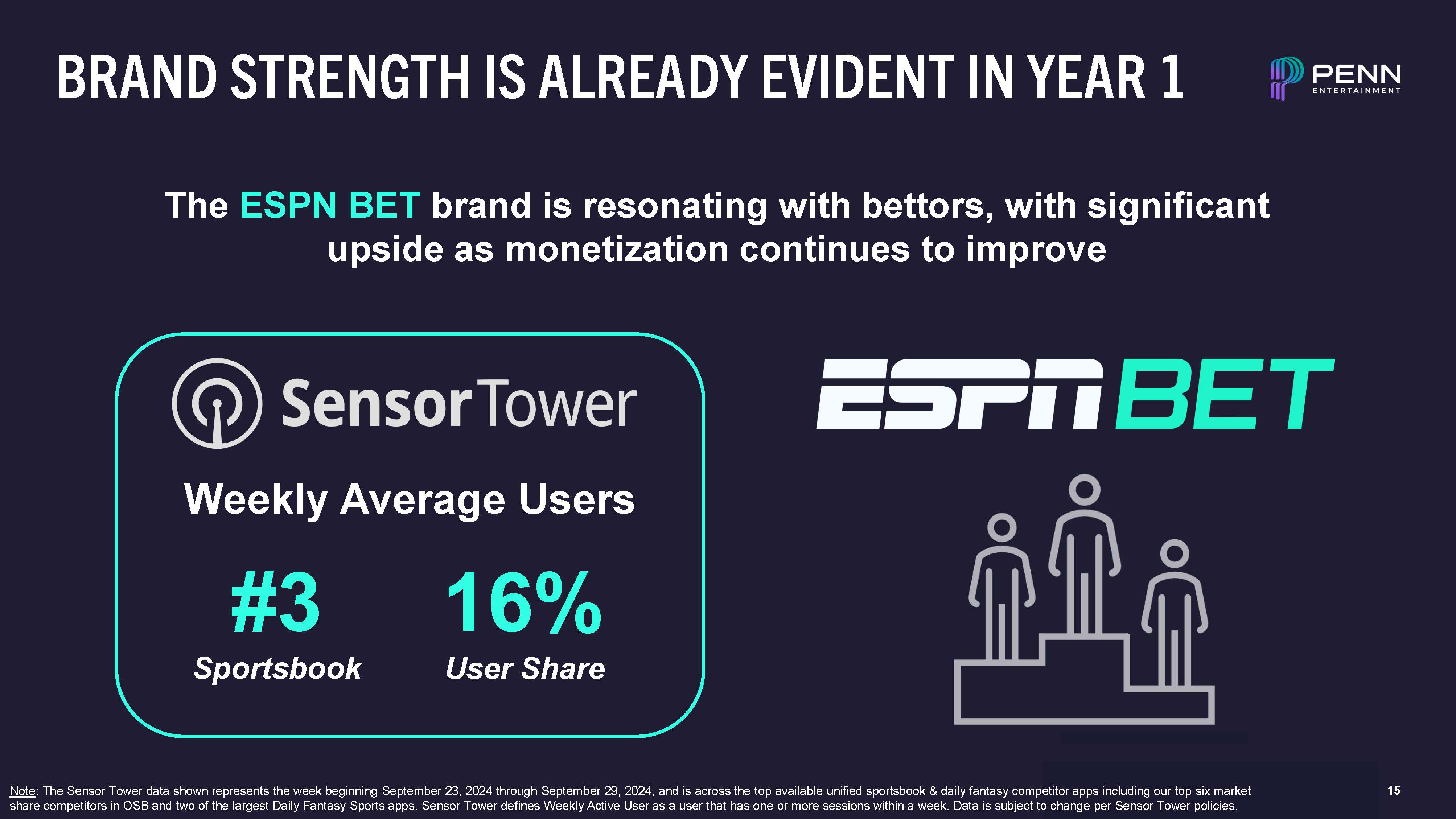 15  BRAND STRENGTH IS ALREADY EVIDENT IN YEAR 1  16%  User Share  #3  Sportsbook  The ESPN BET brand is resonating with bettors, with significant upside as monetization continues to improve  Weekly Average Users  Note: The Sensor Tower data shown represents the week beginning September 23, 2024 through September 29, 2024, and is across the top available unified sportsbook & daily fantasy competitor apps including our top six market share competitors in OSB and two of the largest Daily Fantasy Sports apps. Sensor Tower defines Weekly Active User as a user that has one or more sessions within a week. Data is subject to change per Sensor Tower policies.