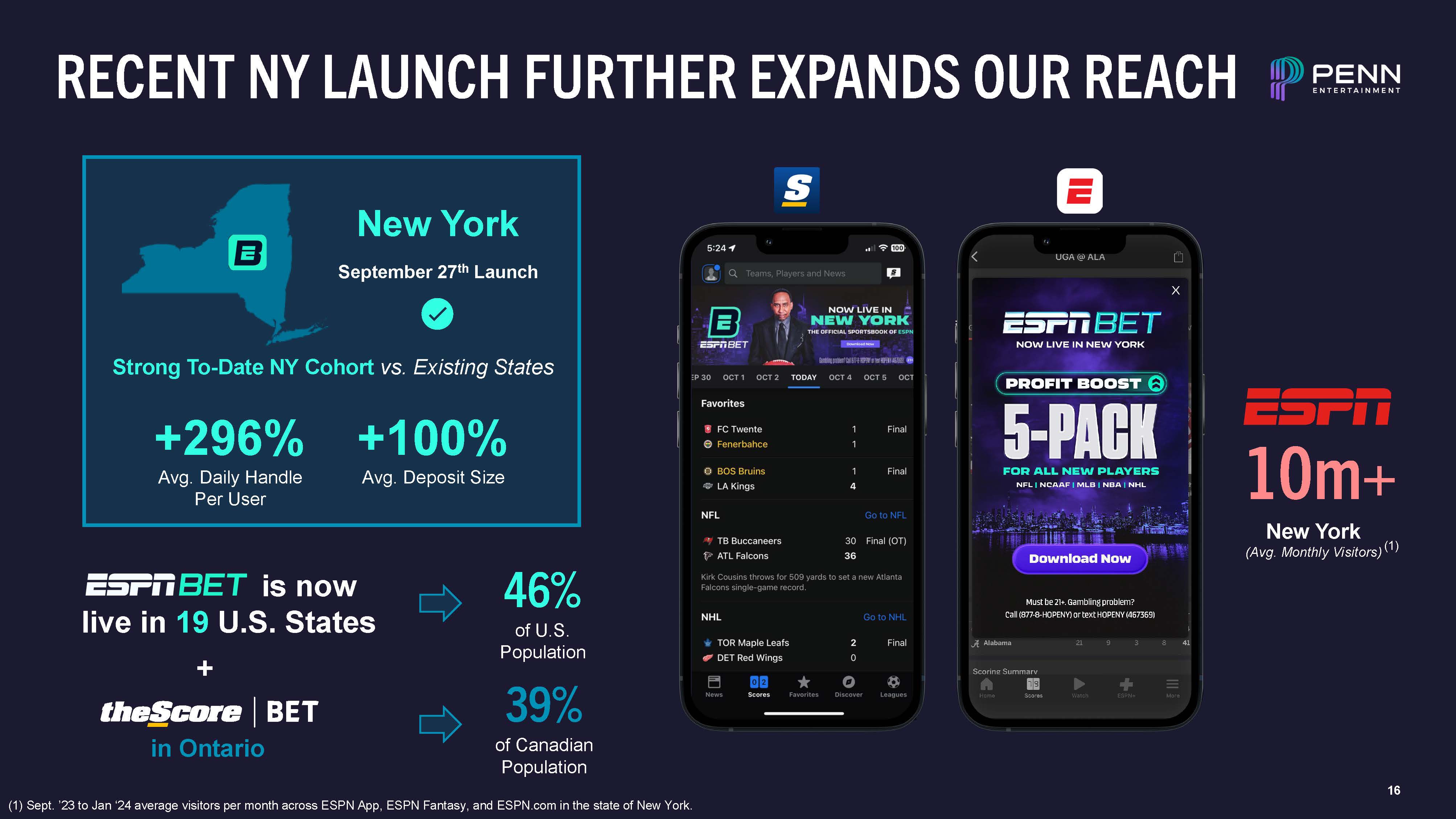 16  RECENT NY LAUNCH FURTHER EXPANDS OUR REACH  New York  September 27th Launch  (1) Sept. ’23 to Jan ‘24 average visitors per month across ESPN App, ESPN Fantasy, and ESPN.com in the state of New York.  10m+  New York  (Avg. Monthly Visitors) (1)  Strong To-Date NY Cohort vs. Existing States  +296%  Avg. Daily Handle Per User  +100%  Avg. Deposit Size  is now live in 19 U.S. States  +  in Ontario  46%  of U.S. Population  39%  of Canadian Population