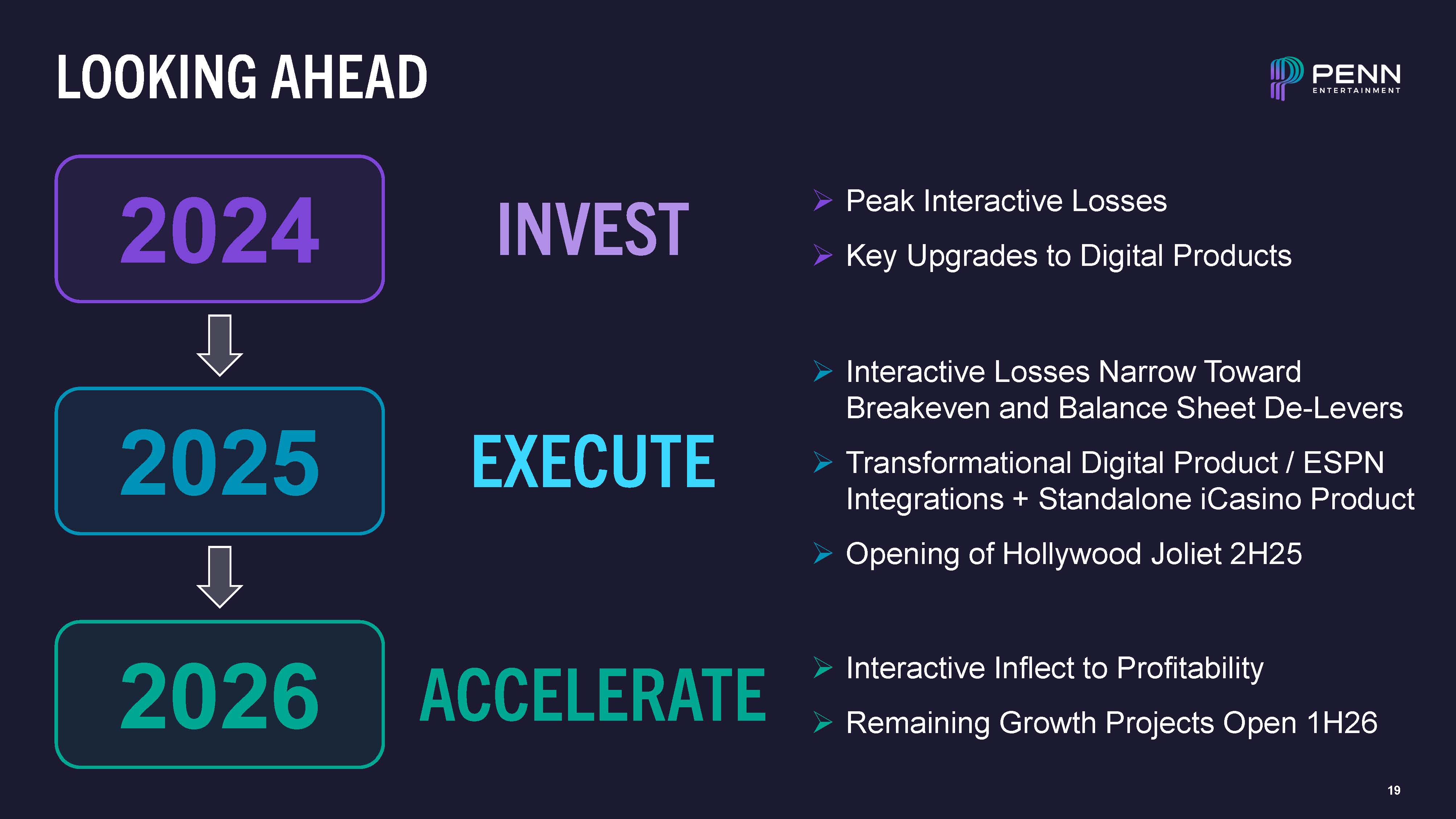 2024  LOOKING AHEAD  Peak Interactive Losses  Key Upgrades to Digital Products  Interactive Losses Narrow Toward Breakeven and Balance Sheet De-Levers  Transformational Digital Product / ESPN Integrations + Standalone iCasino Product  Opening of Hollywood Joliet 2H25  Interactive Inflect to Profitability  Remaining Growth Projects Open 1H26  2025  2026  INVEST  17  EXECUTE  ACCELERATE