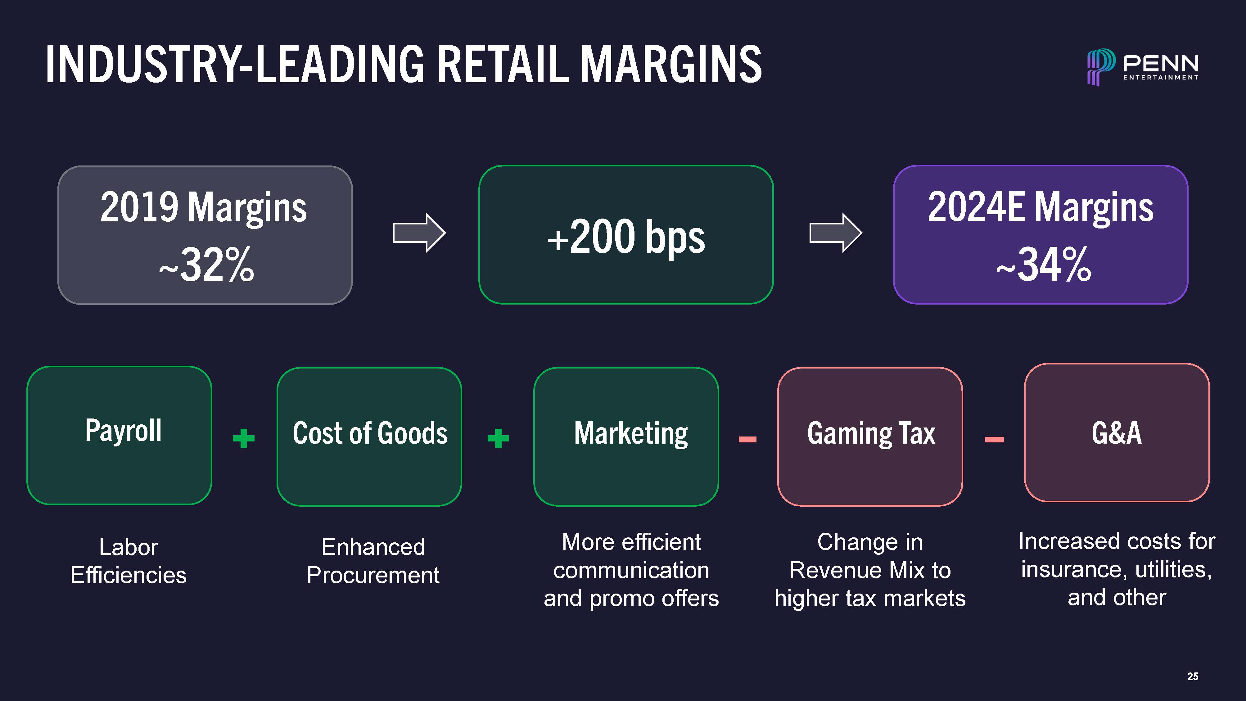 INDUSTRY-LEADING RETAIL MARGINS  Labor Efficiencies  Enhanced Procurement  More efficient communication and promo offers  Change in Revenue Mix to higher tax markets  Increased costs for insurance, utilities, and other  +200 bps  2024E Margins  ~34%  Payroll  Cost of Goods  Marketing  Gaming Tax  G&A  2019 Margins  ~32%  24