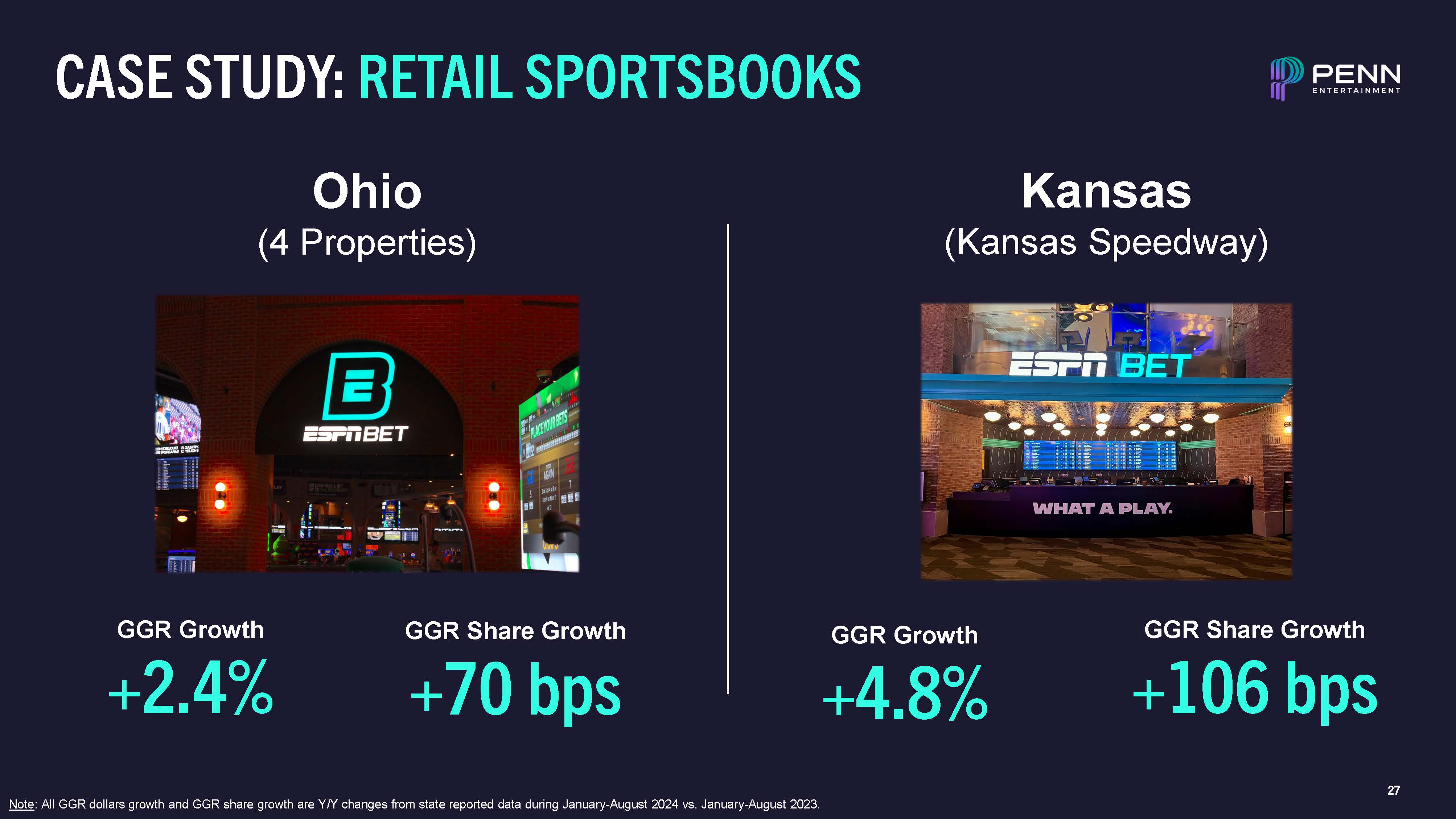 26  A LEADER IN RETAIL SPORTS BETTING  30 Retail Sportsbooks in 13 States  Retail Sports Betting GGR Market Share  26%  Active States  17%  Total U.S. ex-NV  Hollywood Greektown (MI) Hollywood Kansas Speedway (KS) L’Auberge Baton Rouge (LA) Margaritaville Bossier City (LA) Hollywood Columbus (OH) Hollywood Perryville (MD) Hollywood Toledo (OH)  L’Auberge Lake Charles (LA)  Recent Retail Sportsbook Rebrandings  Note: Retail Sports Betting GGR Market Share shown above is for the period 1H24 using publicly reported state and internal company data.