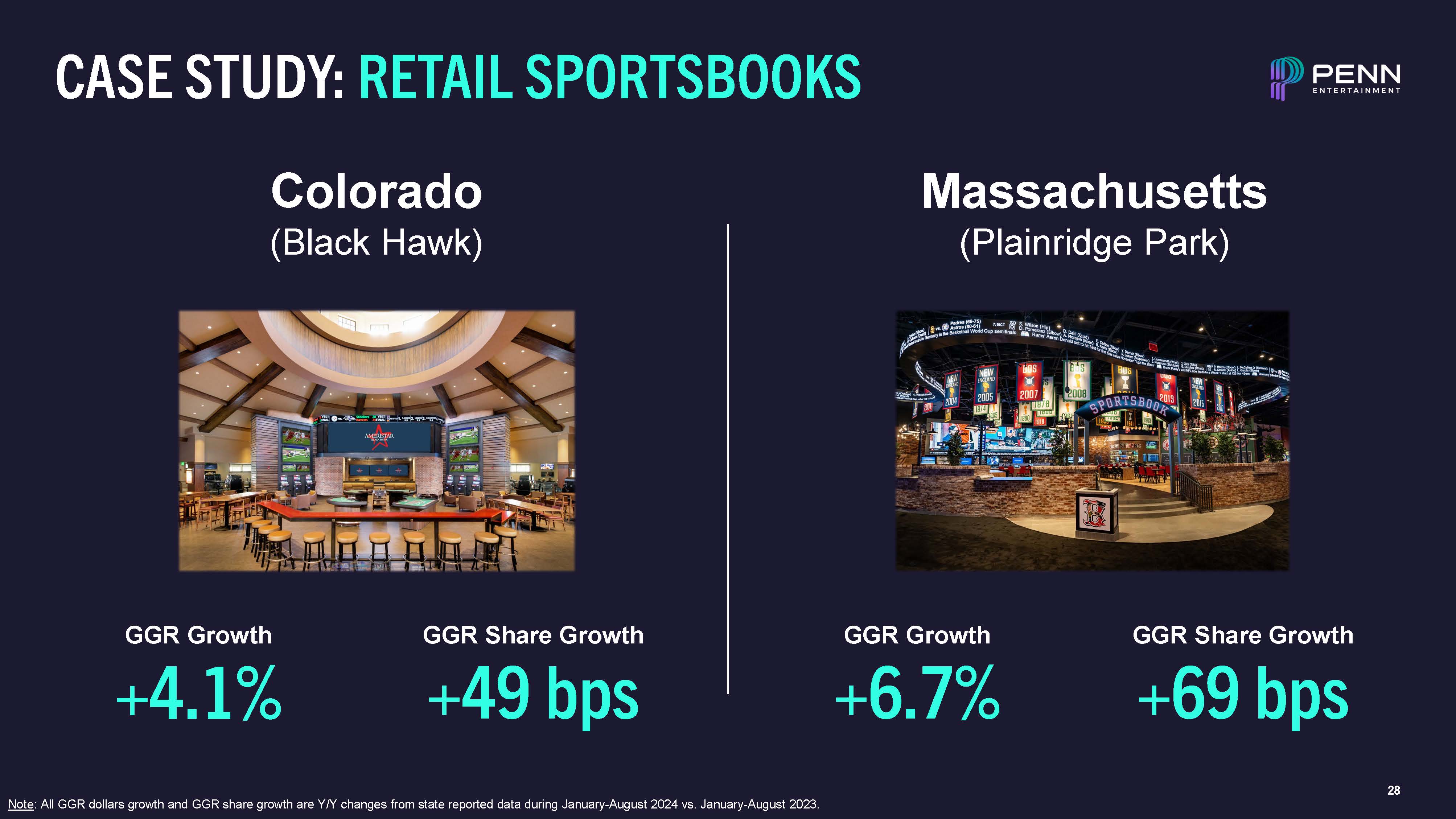 CASE STUDY: RETAIL SPORTSBOOKS  GGR Growth  +4.1%  GGR Growth  +6.7%  GGR Share Growth  +49 bps  GGR Share Growth  +69 bps  Colorado  (Black Hawk)  Massachusetts  (Plainridge Park)  27  Note: All GGR dollars growth and GGR share growth are Y/Y changes from state reported data during January-August 2024 vs. January-August 2023.