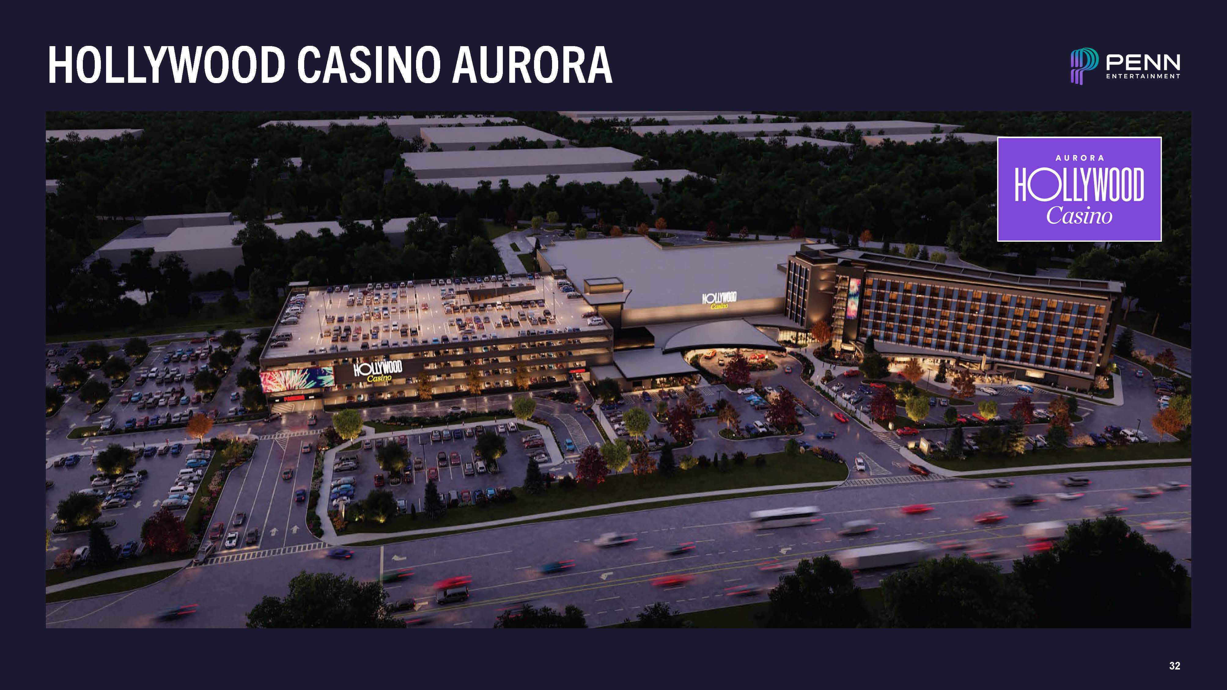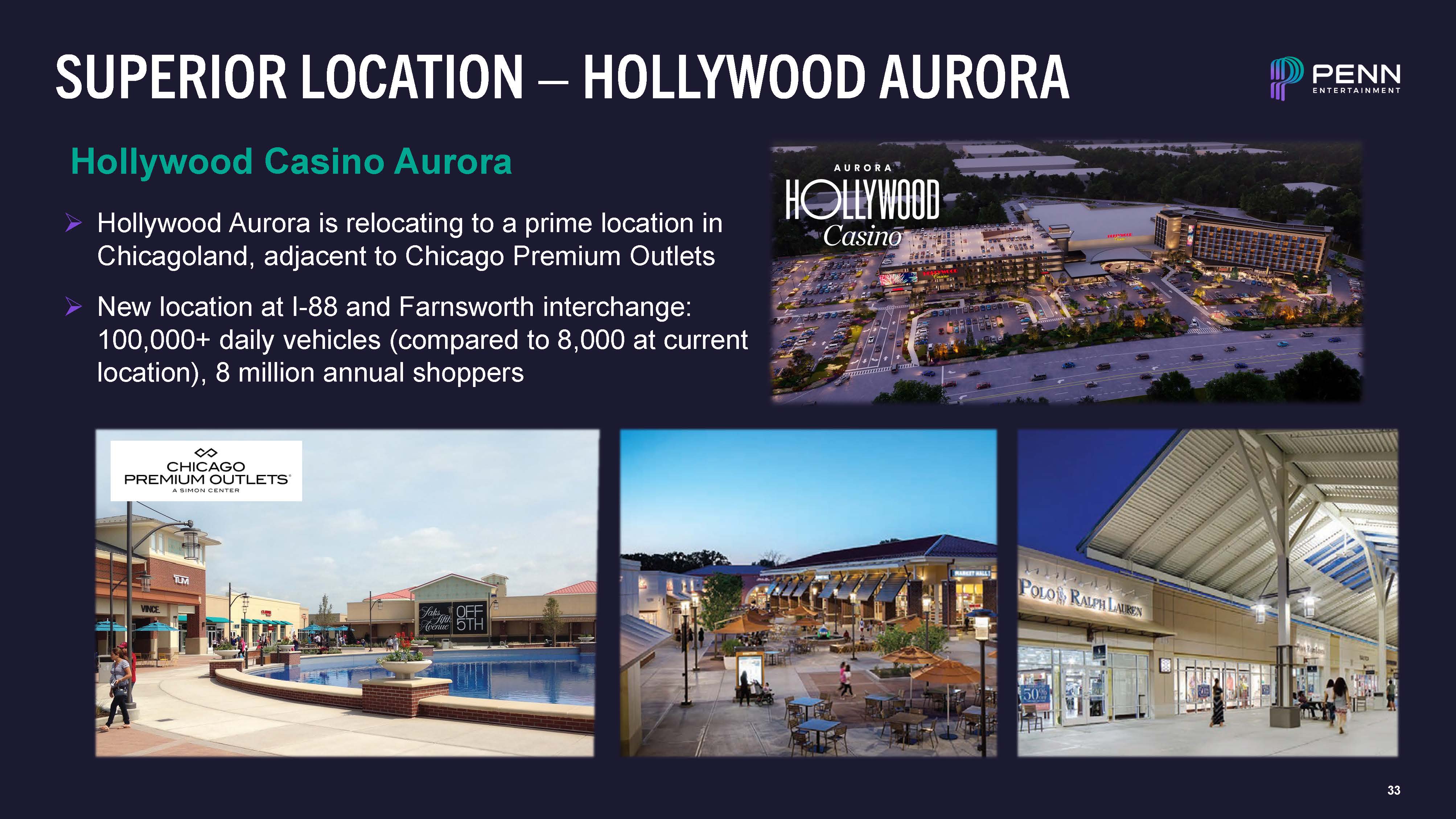 SUPERIOR LOCATION – HOLLYWOOD AURORA  Hollywood Casino Aurora  Hollywood Aurora is relocating to a prime location in Chicagoland, adjacent to Chicago Premium Outlets  New location at I-88 and Farnsworth interchange: 100,000+ daily vehicles (compared to 8,000 at current location), 8 million annual shoppers  29