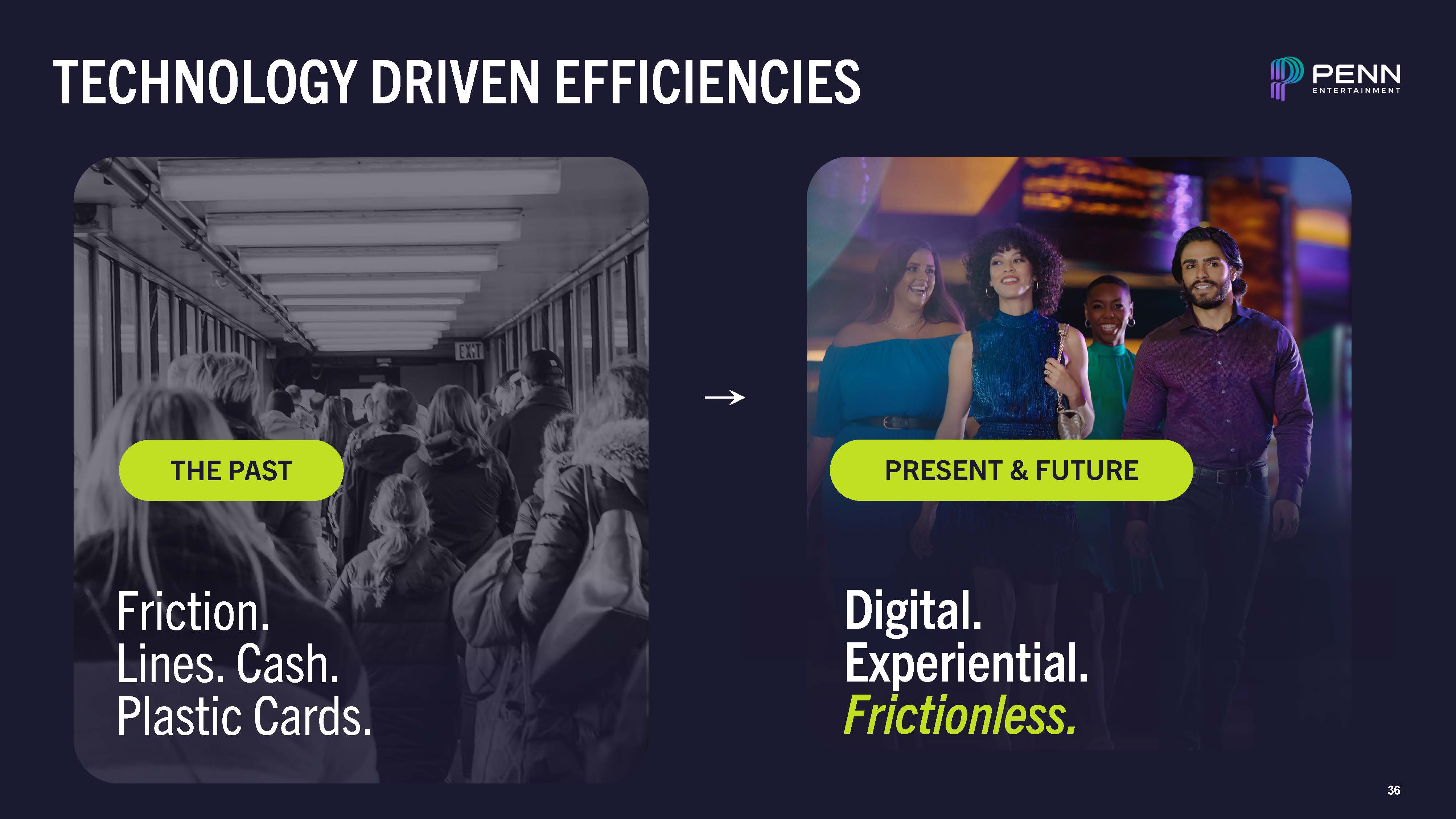 TECHNOLOGY DRIVEN EFFICIENCIES  Friction. Lines. Cash. Plastic Cards.  Digital. Experiential. Frictionless.  THE PAST  35  PRESENT & FUTURE