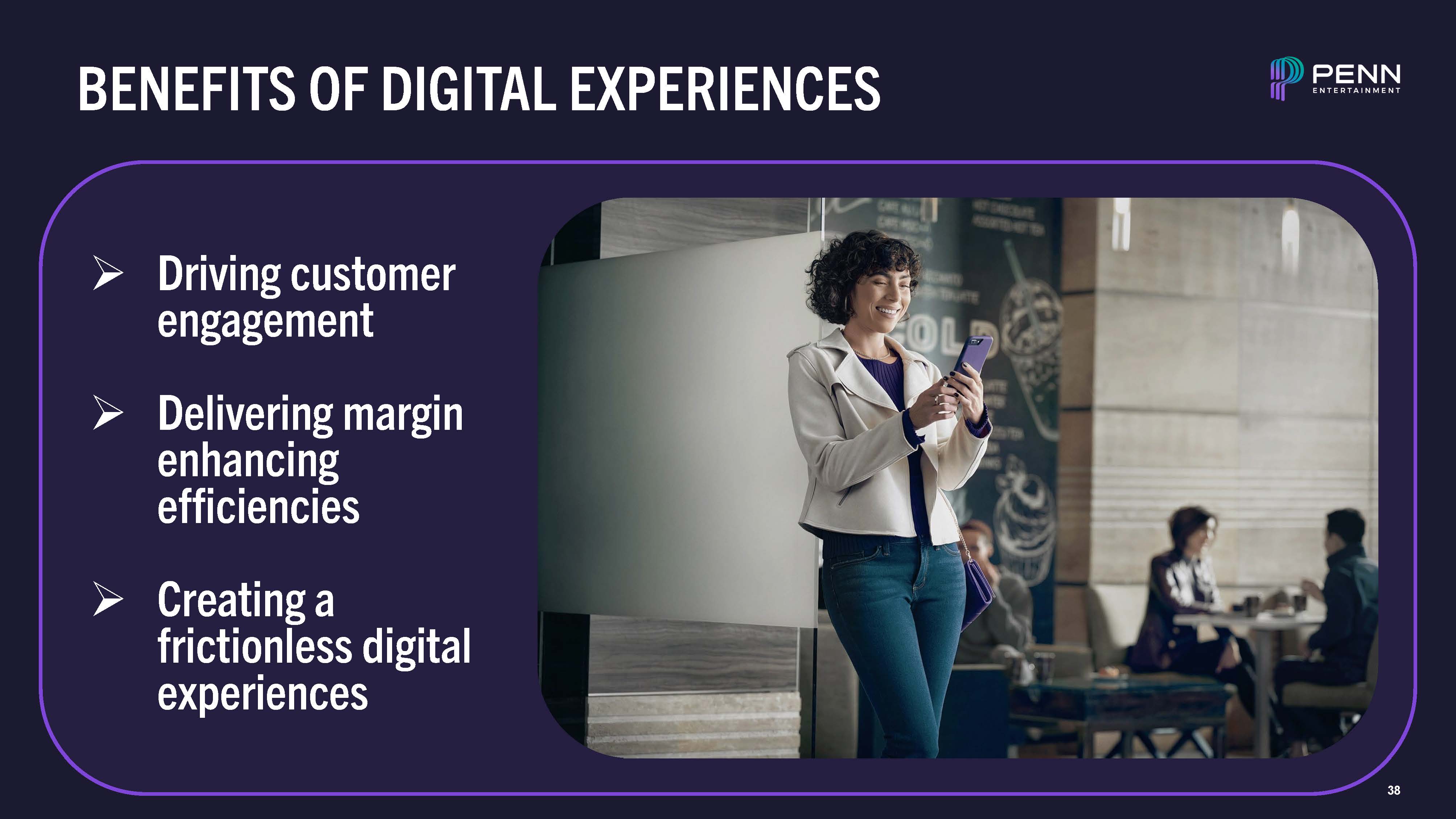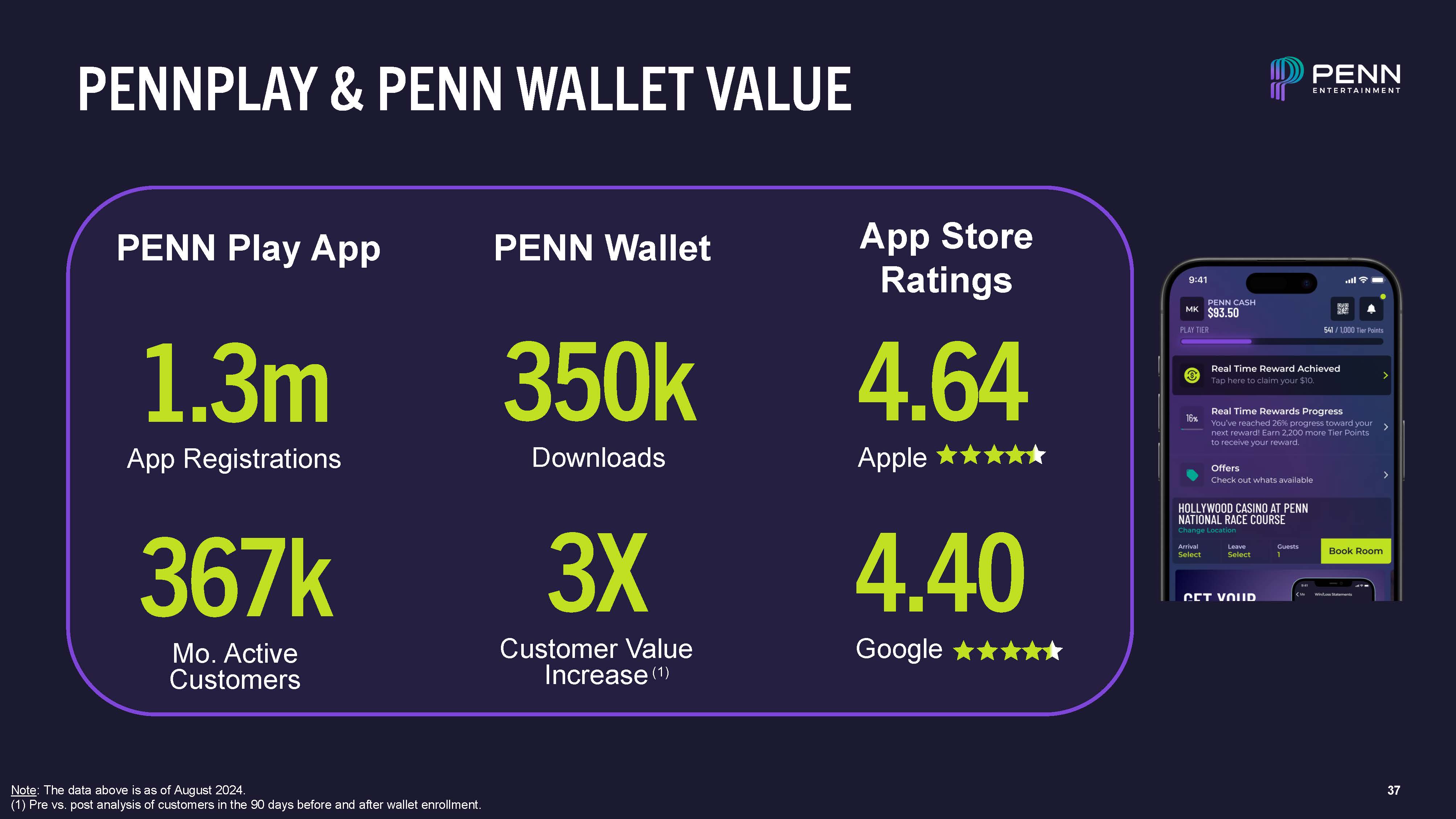 37  PENNPLAY & PENN WALLET VALUE  Note: The data above is as of August 2024.  (1) Pre vs. post analysis of customers in the 90 days before and after wallet enrollment.  1.3m  App Registrations  367k  Mo. Active Customers  350k  Downloads  4.40  Google  PENN Play App  PENN Wallet  App Store Ratings  4.64  Apple  3X  Customer Value Increase (1)