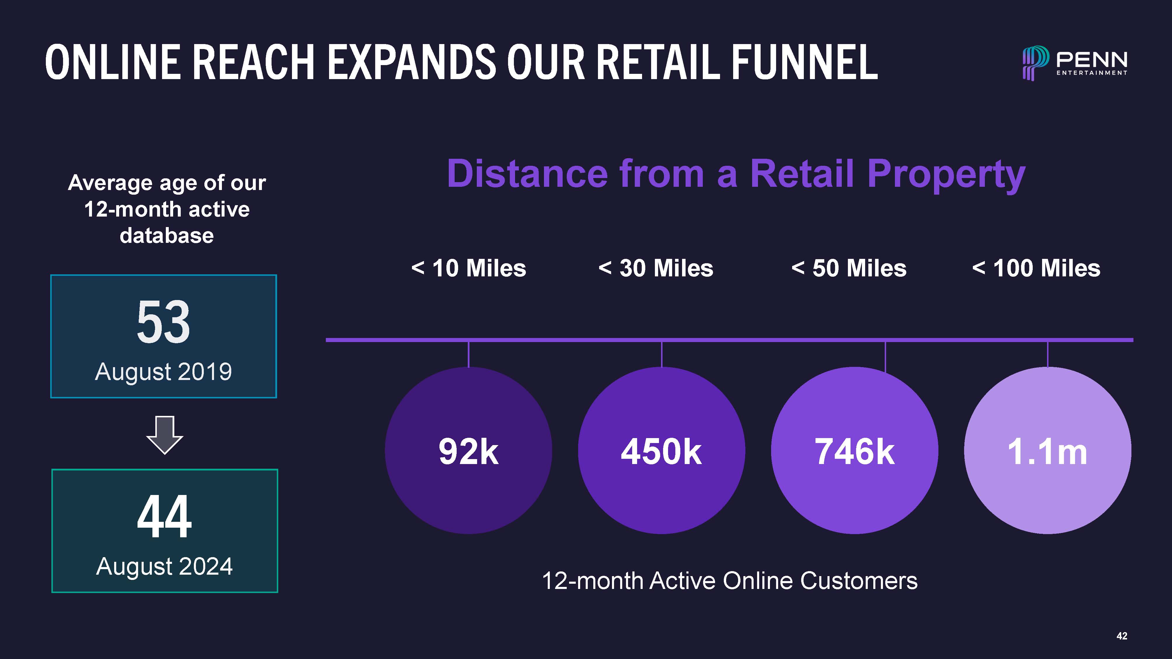 41  ONLINE HAS DRIVEN COMPANY DATABASE GROWTH  0.1  0.3  0.9  1.7  2.1  3.9  2019  2020  2021  2022 Q3 2023 Q3 2024  Total Digital Database (M)  Since ESPN BET Launch  +1.8M Digital Members  +85% Growth  2019  Total: 25M  Digital: NM  Q3 2024  Total: 31M  Digital: 3.9M  67%  of our total database growth since 2019 has come from digital  Note: All Q3 2024 data is preliminary.