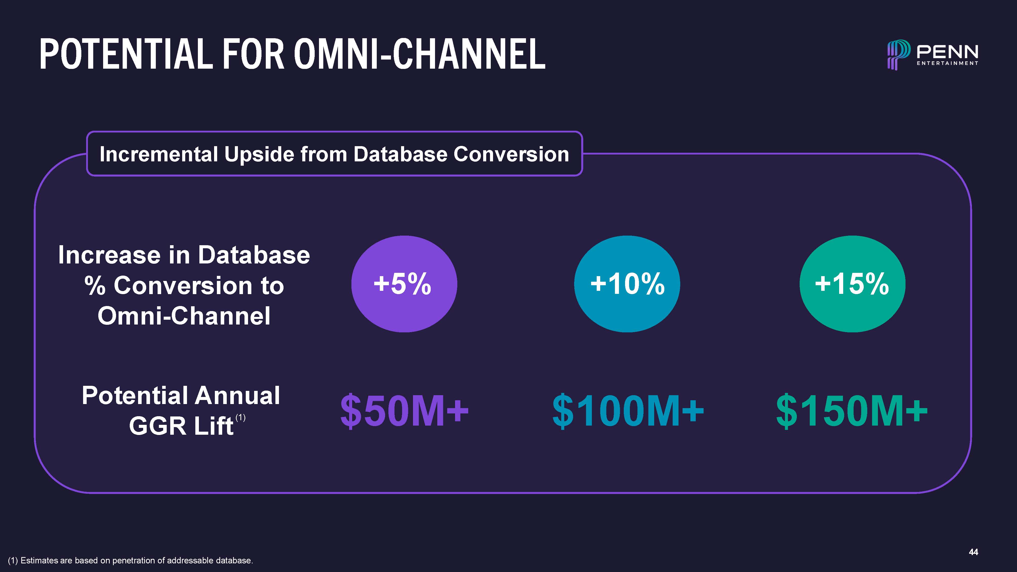 44  POTENTIAL FOR OMNI-CHANNEL  +10%  +15%  +5%  Increase in Database  % Conversion to Omni-Channel  Incremental Upside from Database Conversion  (1) Estimates are based on penetration of addressable database.  Potential Annual  GGR Lift(1)  $50M+  $100M+  $150M+