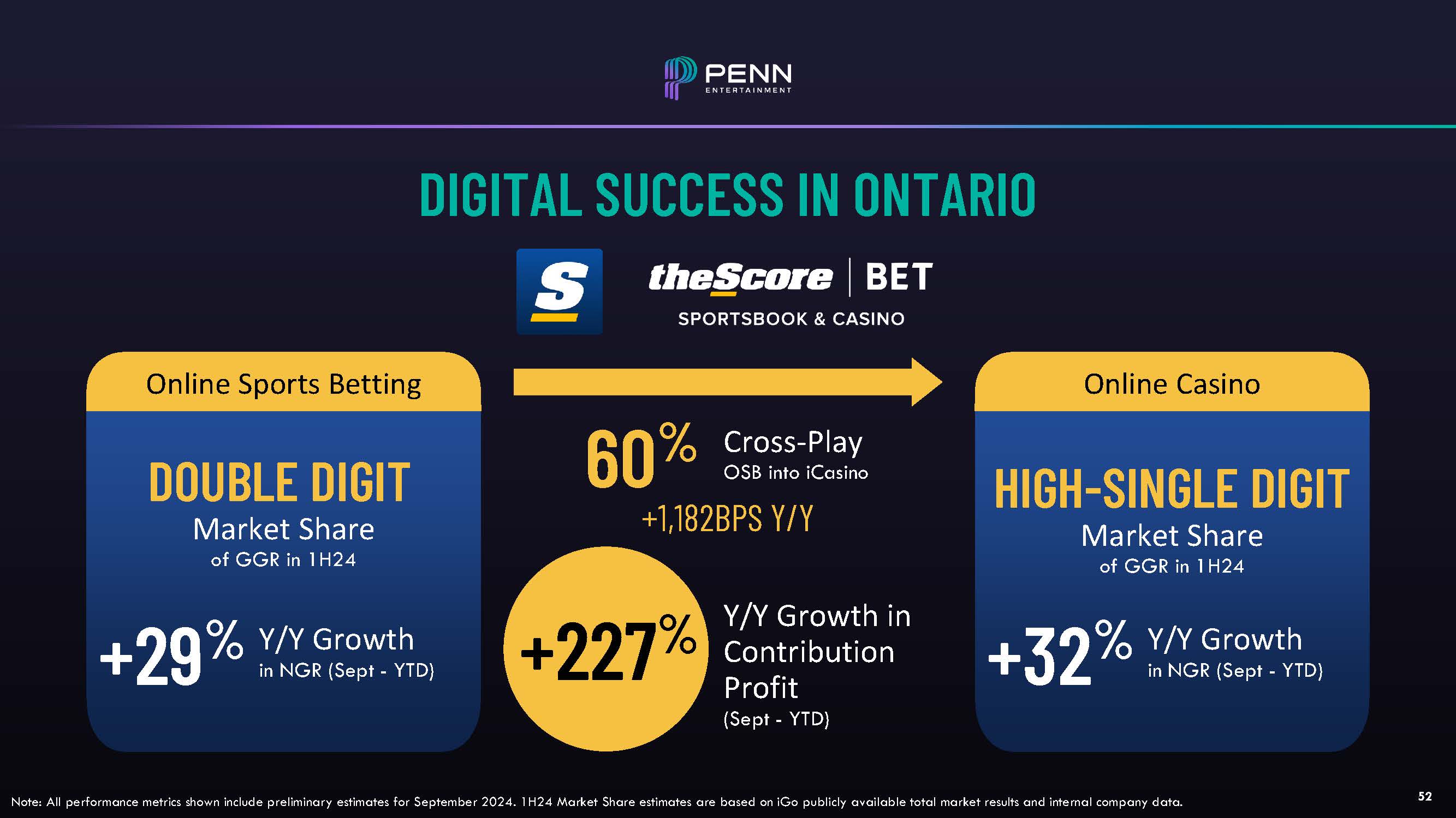 DIGITAL SUCCESS IN ONTARIO  Online Sports Betting  +29  DOUBLE DIGIT  Market Share  of GGR in 1H24  % Y/Y Growth  in NGR (Sept - YTD)  Online Casino  +32  HIGH-SINGLE DIGIT  Market Share  of GGR in 1H24  % Y/Y Growth  in NGR (Sept - YTD)  60%  Cross-Play  OSB into iCasino  +1,182BPS Y/Y  +227%  Y/Y Growth in Contribution Profit  (Sept - YTD)  52  Note: All performance metrics shown include preliminary estimates for September 2024. 1H24 Market Share estimates are based on iGo publicly available total market results and internal company data.