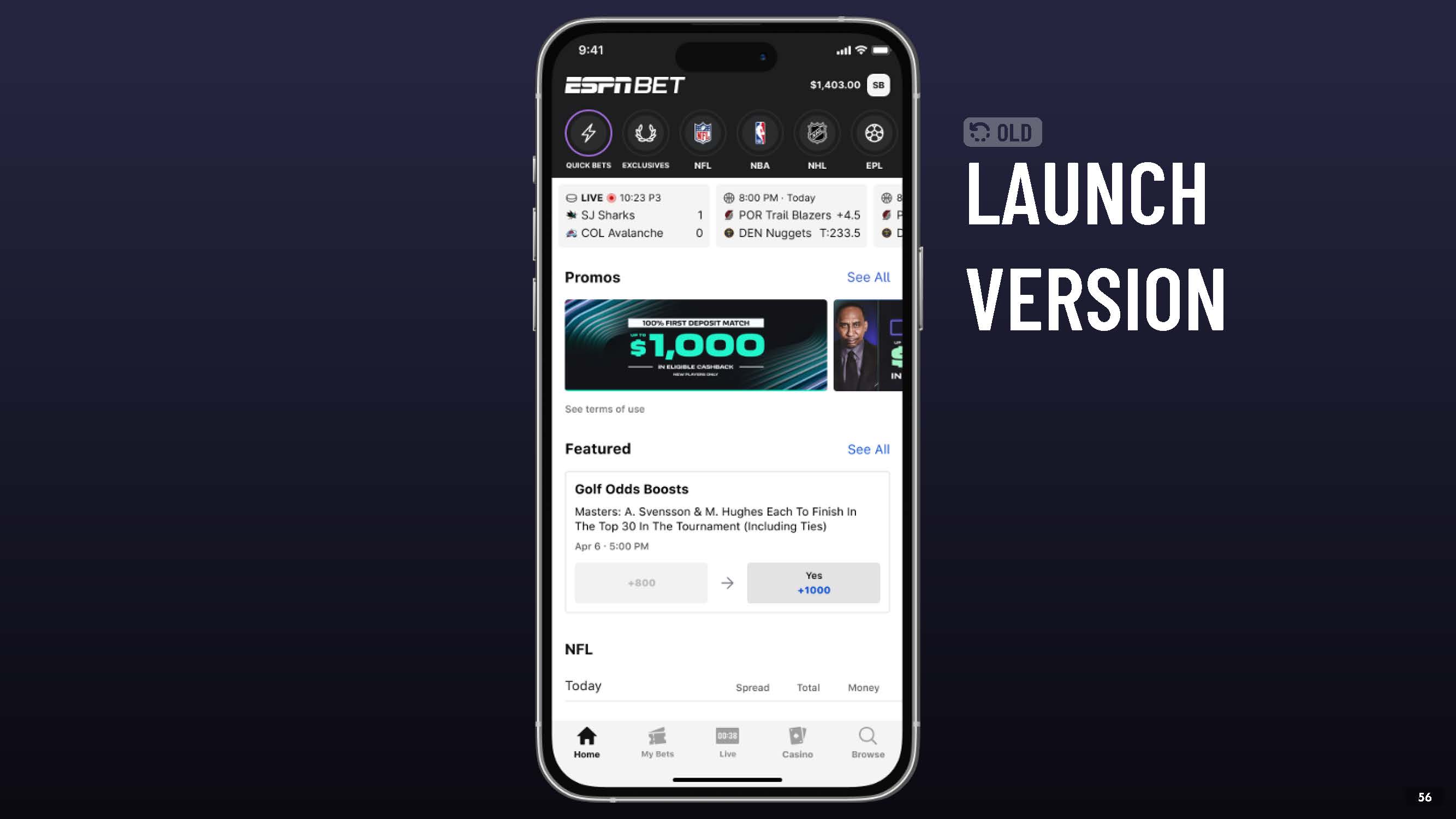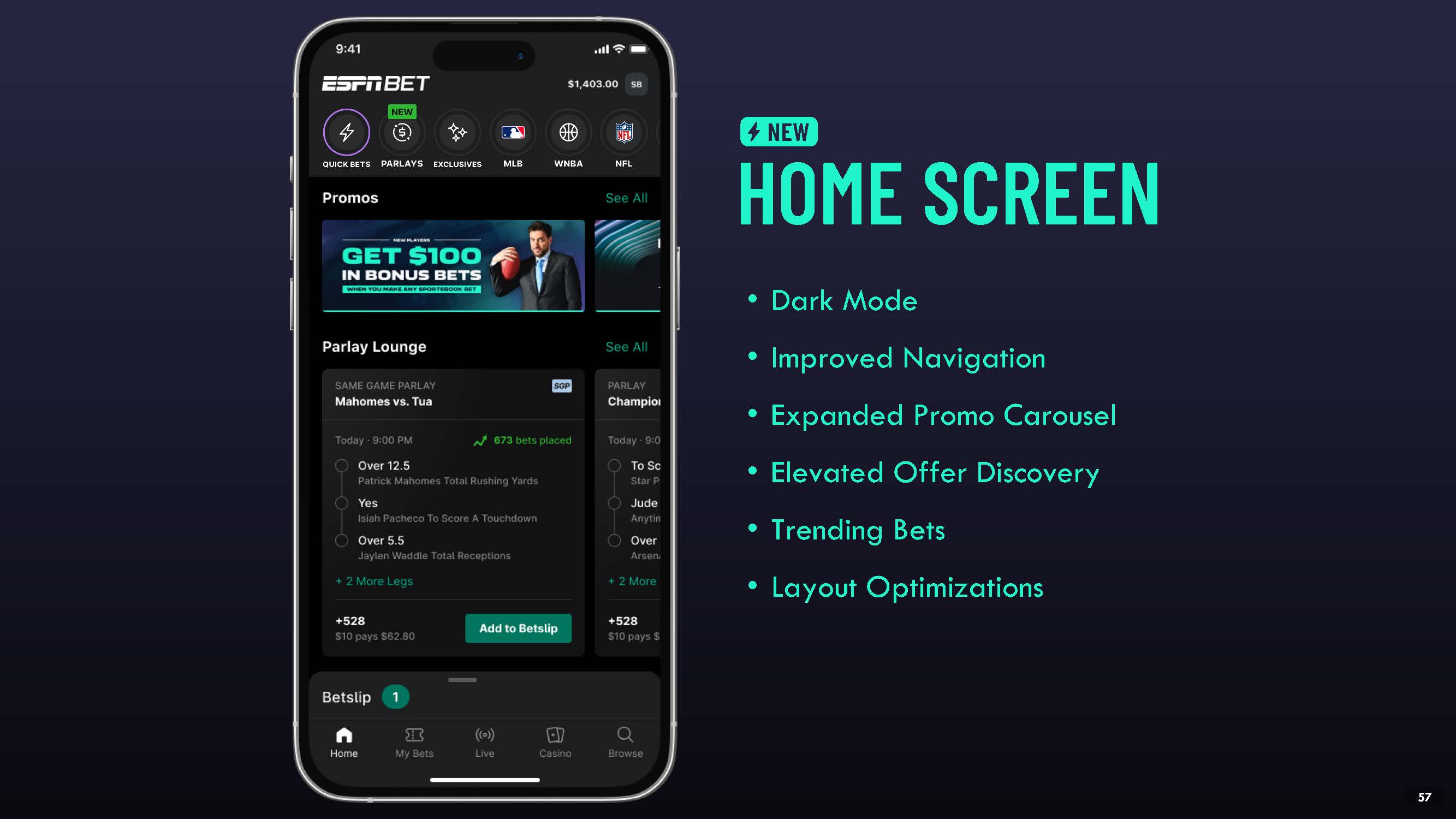 HOME SCREEN  Dark Mode  Improved Navigation  Expanded Promo Carousel  Elevated Offer Discovery  Trending Bets  Layout Optimizations  NEW  53