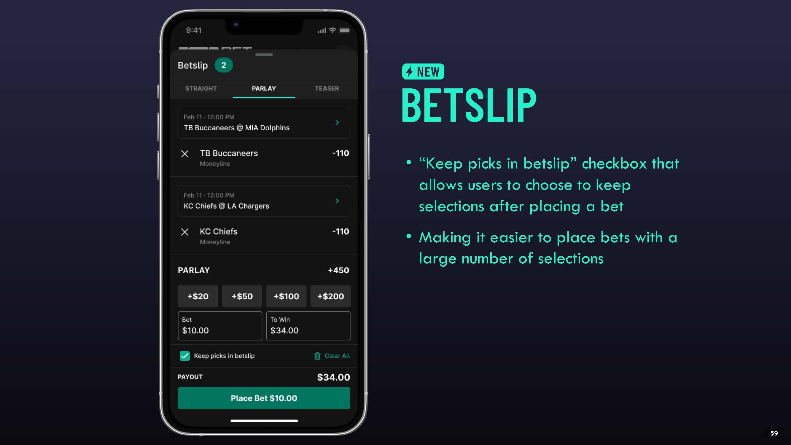 “Keep picks in betslip” checkbox that allows users to choose to keep selections after placing a bet  Making it easier to place bets with a large number of selections  BETSLIP  NEW  53