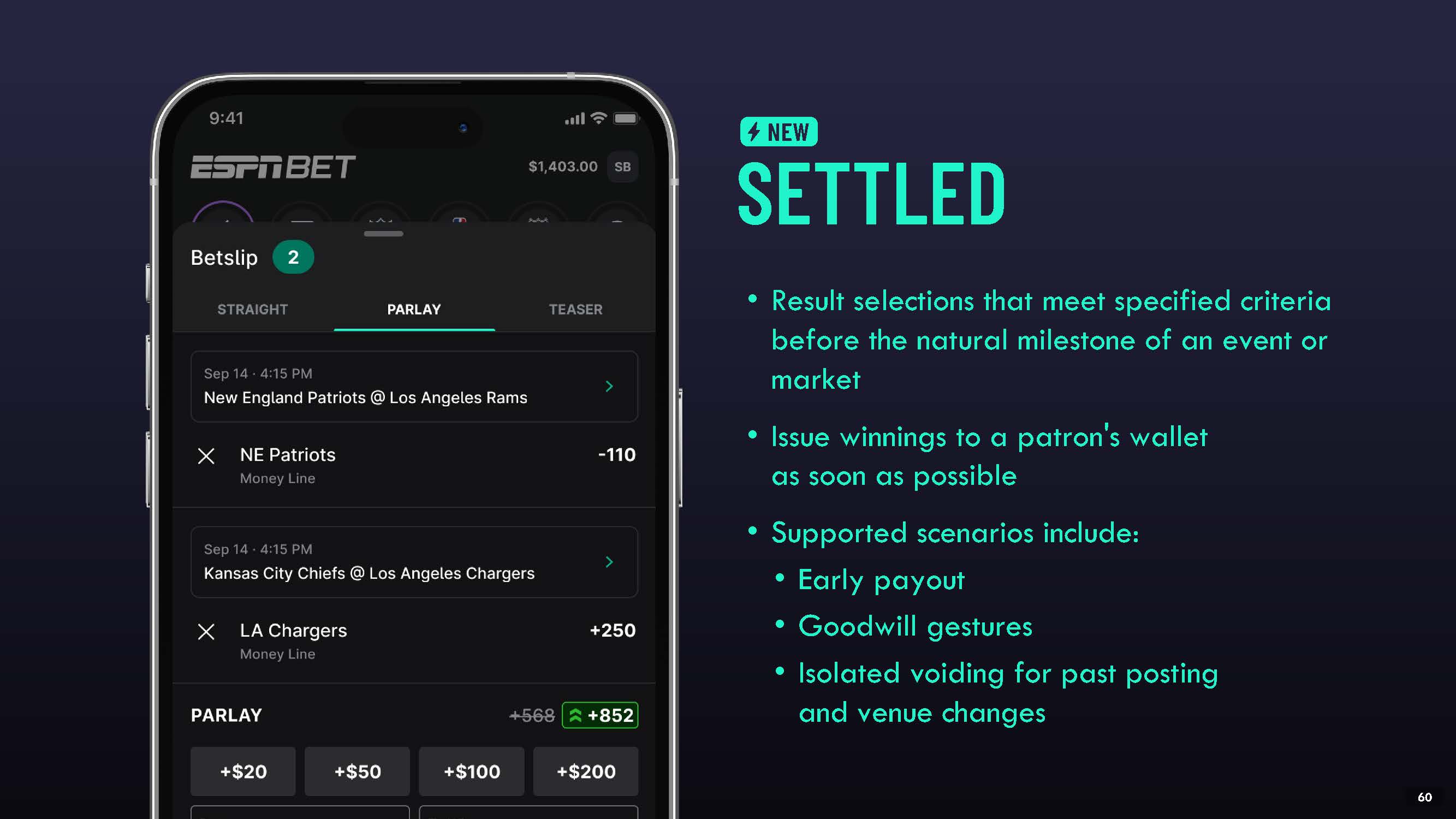 Result selections that meet specified criteria before the natural milestone of an event or market  Issue winnings to a patron's wallet as soon as possible  Supported scenarios include:  Early payout  Goodwill gestures  Isolated voiding for past posting and venue changes  SETTLED  NEW  53