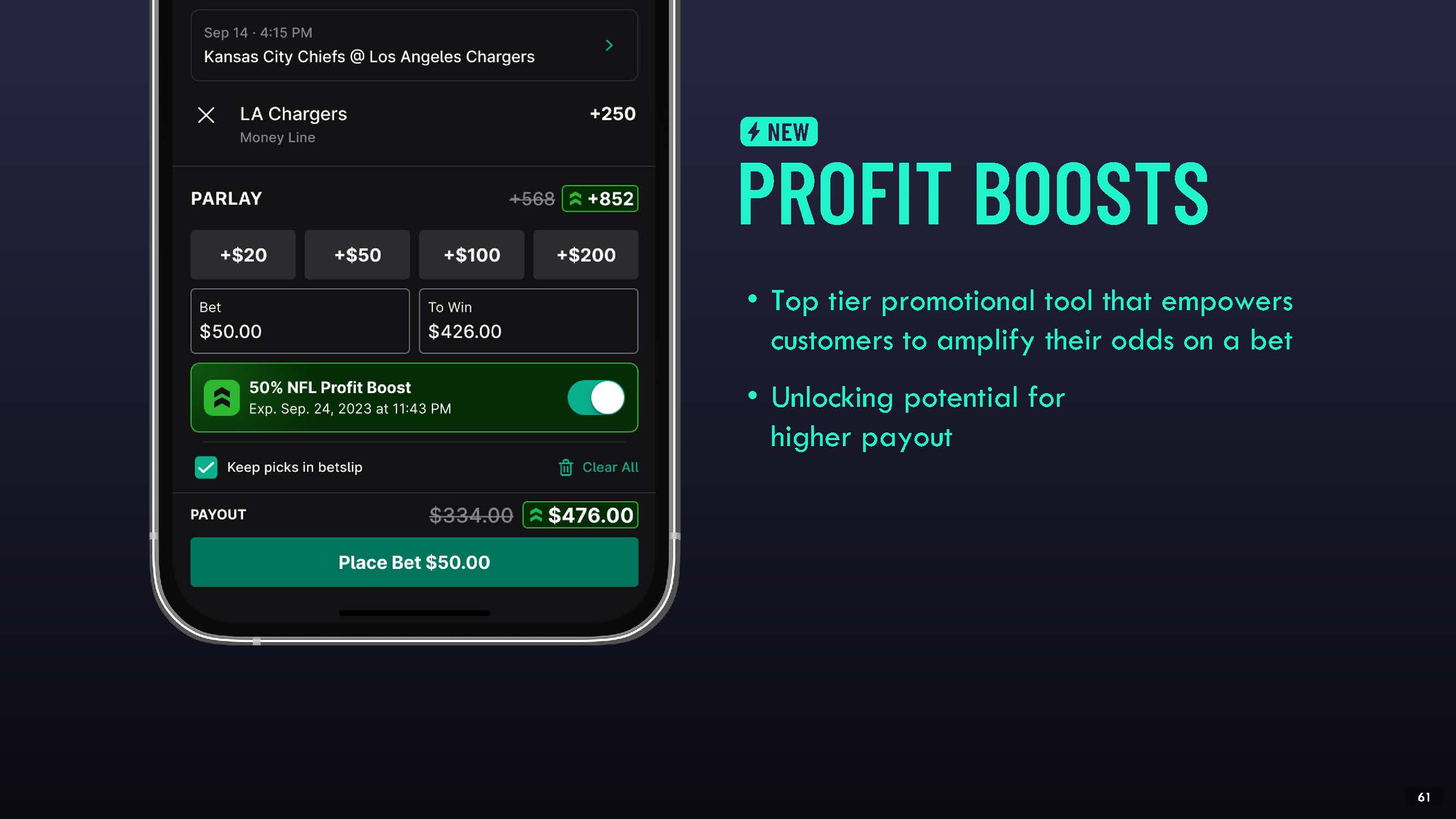 Top tier promotional tool that empowers customers to amplify their odds on a bet  Unlocking potential for higher payout  PROFIT BOOSTS  NEW  53