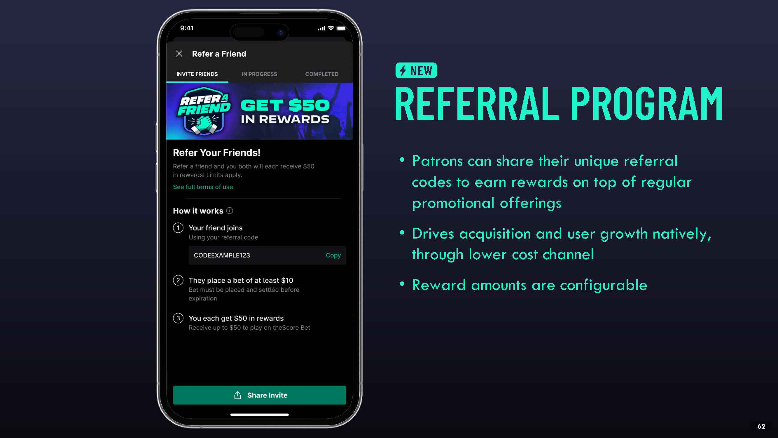 REFERRAL PROGRAM  NEW  Patrons can share their unique referral codes to earn rewards on top of regular promotional offerings  Drives acquisition and user growth natively, through lower cost channel  Reward amounts are configurable  53