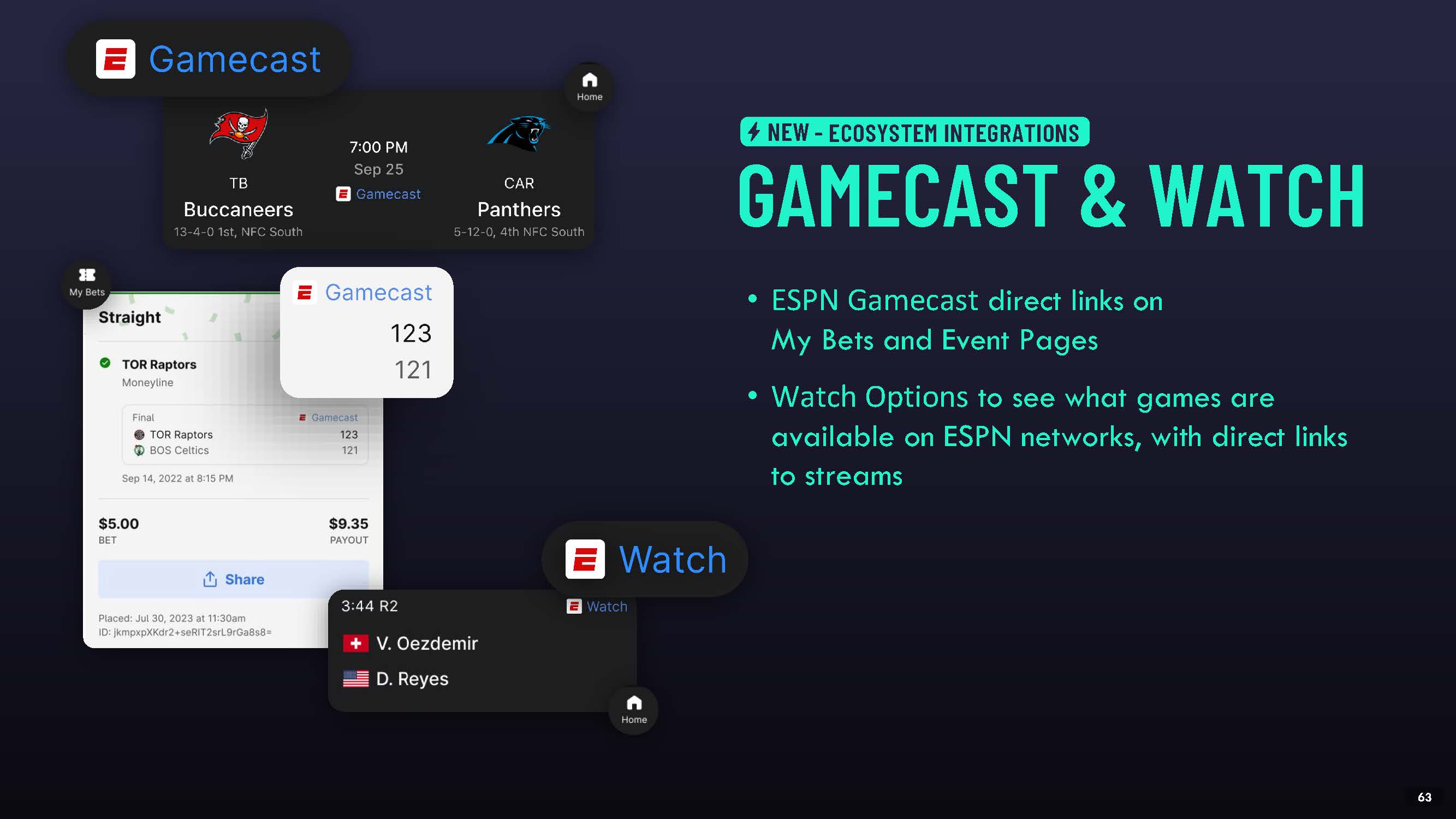 ESPN Gamecast direct links on My Bets and Event Pages  Watch Options to see what games are available on ESPN networks, with direct links to streams  GAMECAST & WATCH  NEW - ECOSYSTEM INTEGRATIONS  53