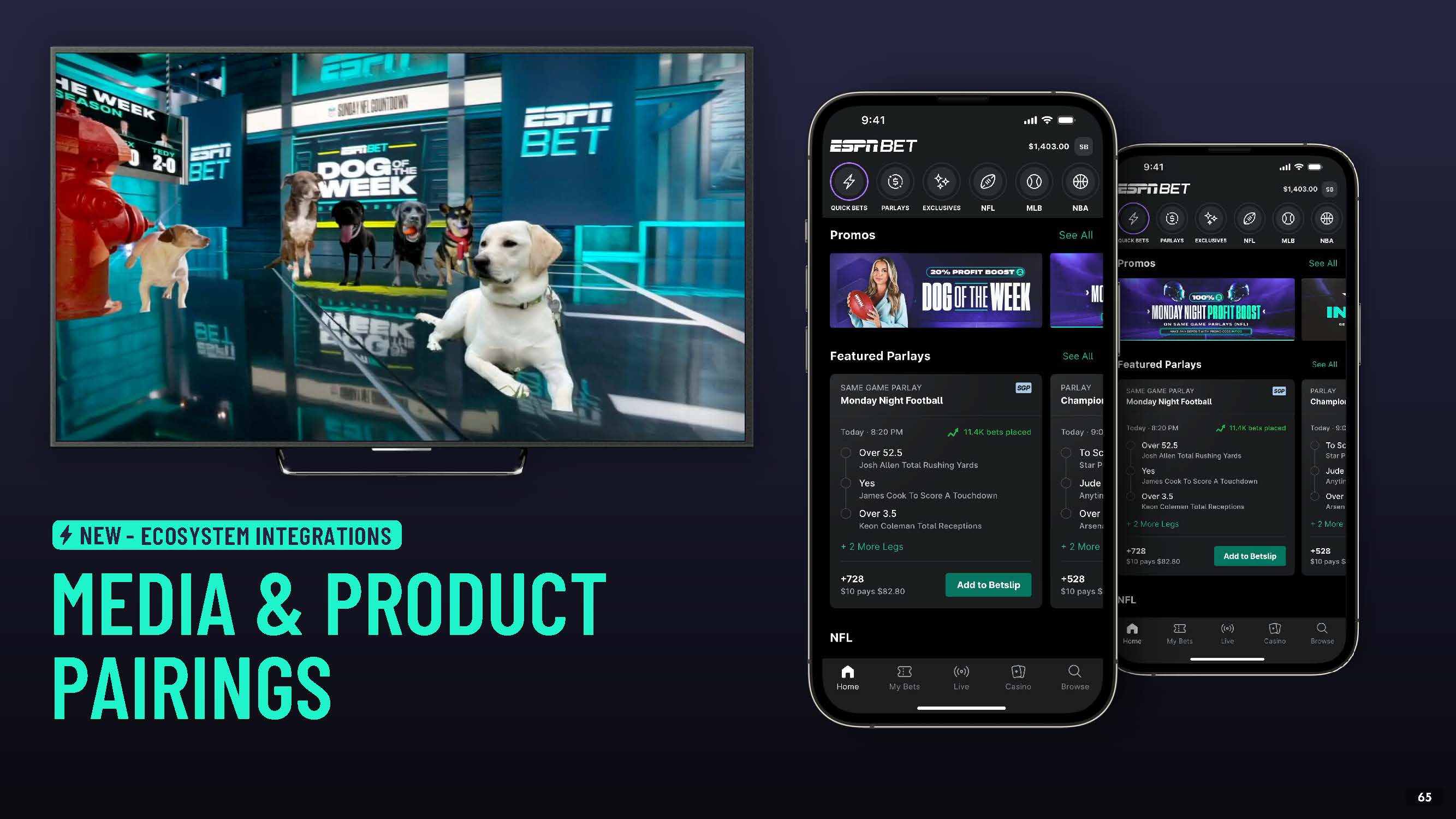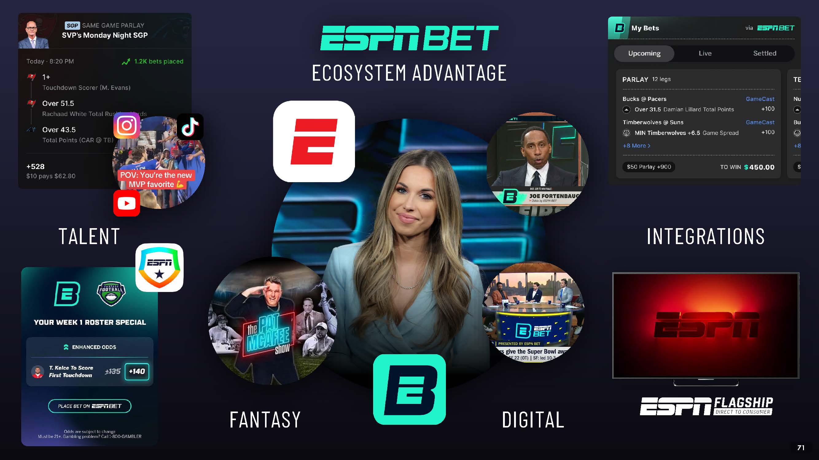 ESPN & FANTASY  Add to Betslip - add market directly to betslip from ESPN or theScore app driving user acquisition and placed bets through tightly integrated experience  ESPN Fantasy Native Activations - Targeted offers based on Fantasy team members and odds link out from  ESPN Fantasy apps  NEW - ECOSYSTEM INTEGRATIONS  53
