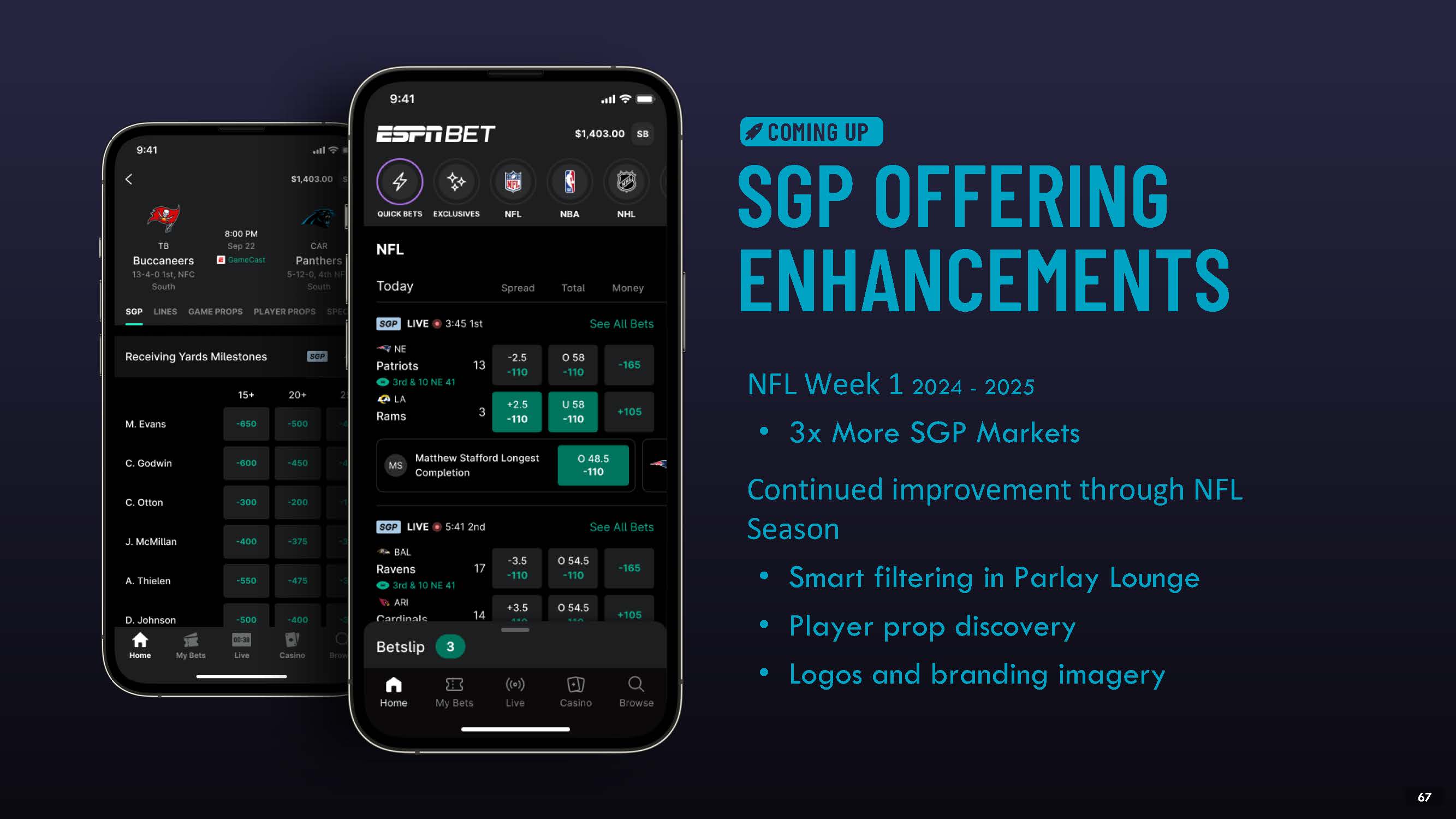 SGP OFFERING ENHANCEMENTS  NFL Week 1 2024 - 2025  3x More SGP Markets  Continued improvement through NFL Season  Smart filtering in Parlay Lounge  Player prop discovery  Logos and branding imagery  COMING UP  53