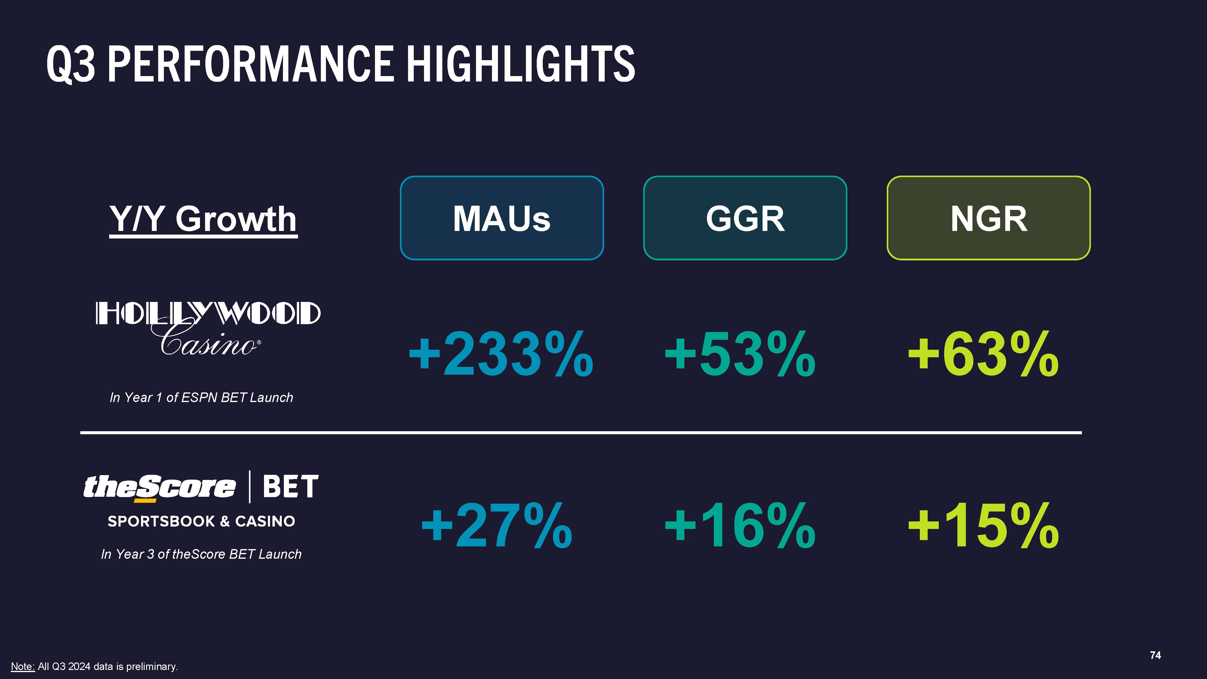 74  Q3 PERFORMANCE HIGHLIGHTS  +233%  +53%  +63%  +27%  +16%  +15%  MAUs  GGR  NGR  Y/Y Growth  In Year 1 of ESPN BET Launch  In Year 3 of theScore BET Launch  Note: All Q3 2024 data is preliminary.