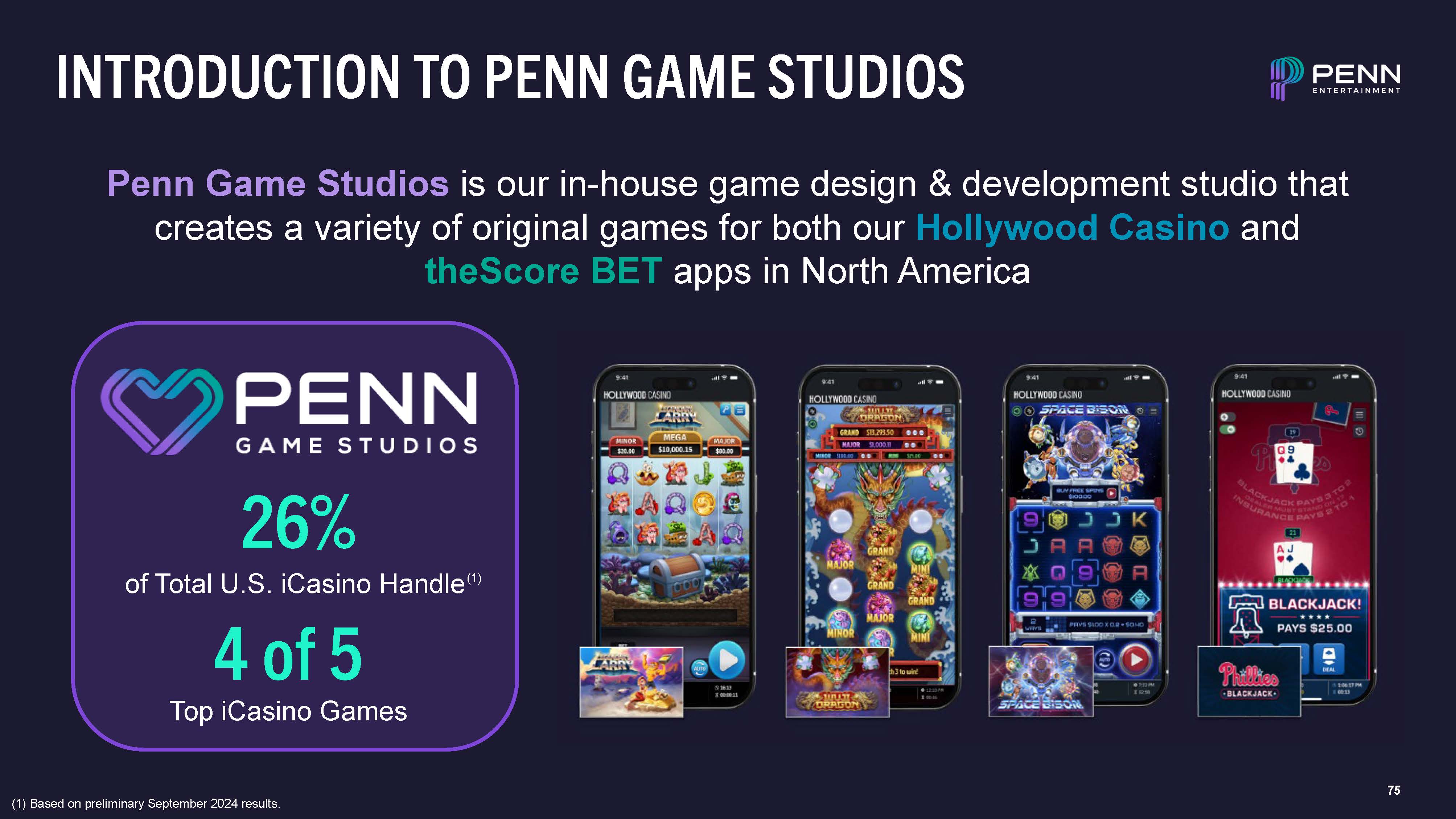 75  INTRODUCTION TO PENN GAME STUDIOS  Penn Game Studios is our in-house game design & development studio that creates a variety of original games for both our Hollywood Casino and theScore BET apps in North America  (1) Based on preliminary September 2024 results.  26%  of Total U.S. iCasino Handle(1)  4 of 5  Top iCasino Games