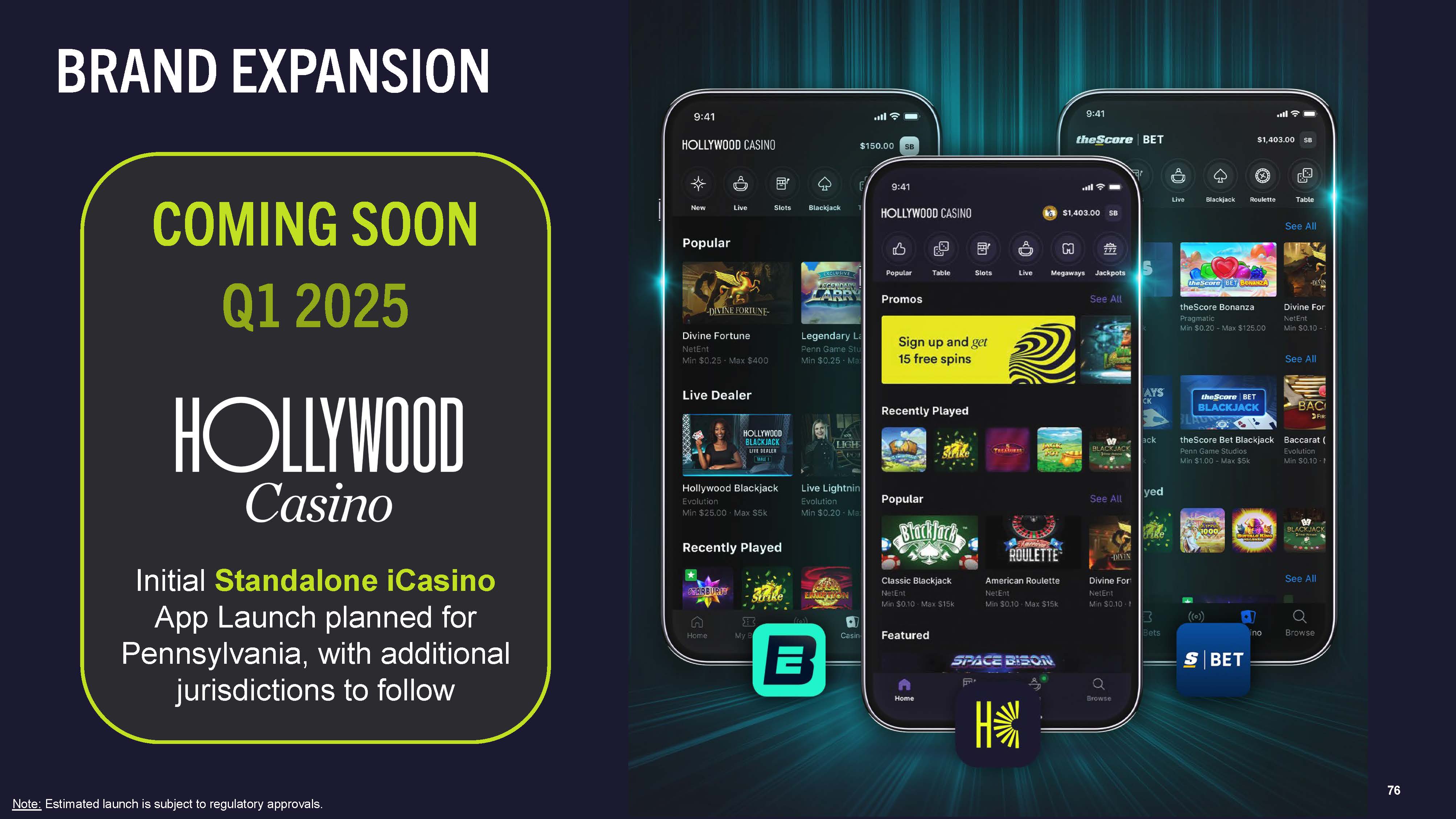 76  Initial Standalone iCasino App Launch planned for Pennsylvania, with additional jurisdictions to follow  COMING SOON Q1 2025  BRAND EXPANSION  Note: Estimated launch is subject to regulatory approvals.