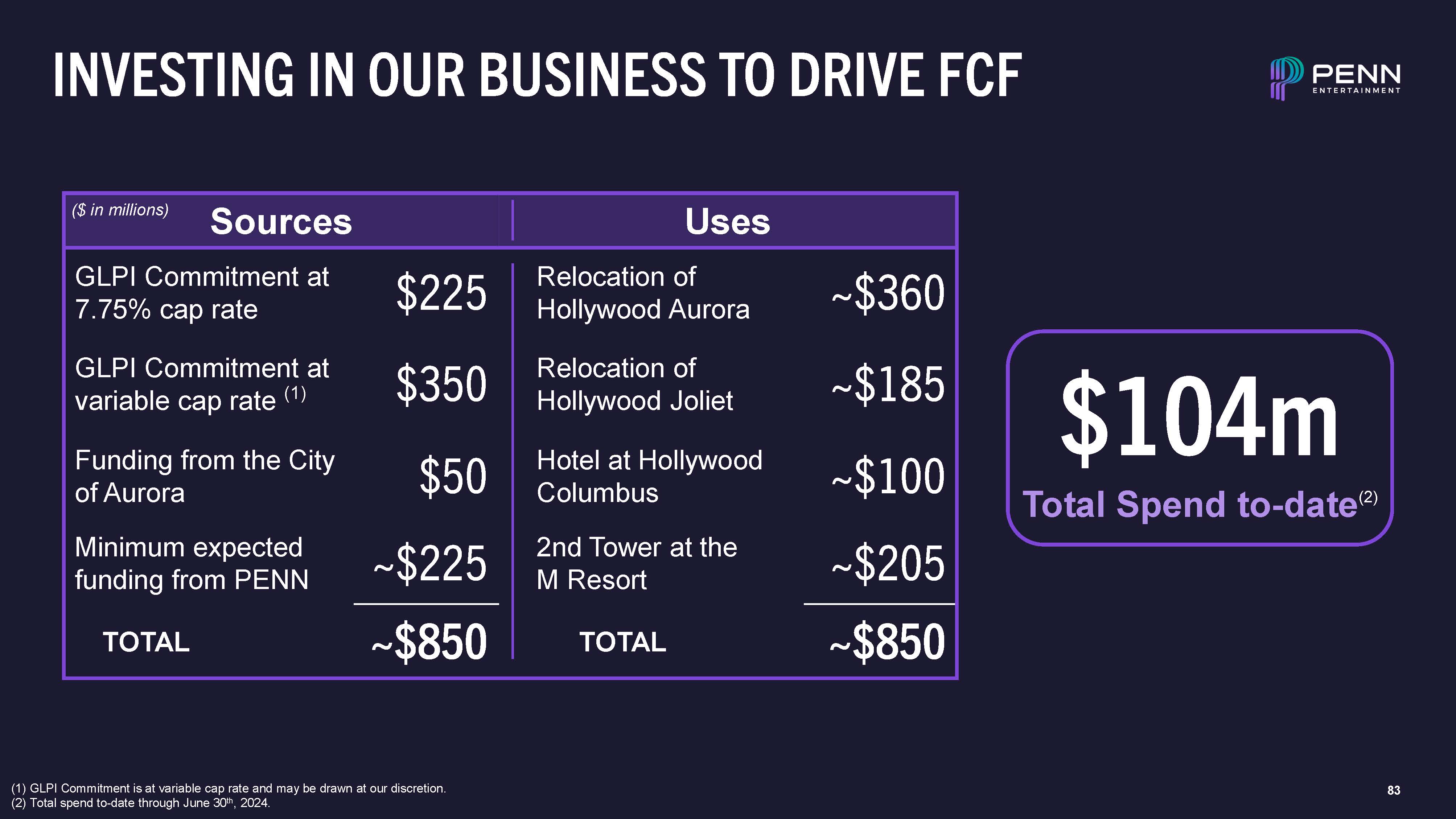 83  INVESTING IN OUR BUSINESS TO DRIVE FCF  ($ in millions) Sources  Uses  GLPI Commitment at 7.75% cap rate  $225  Relocation of Hollywood Aurora  ~$360  GLPI Commitment at variable cap rate (1)  $350  Relocation of Hollywood Joliet  ~$185  Funding from the City of Aurora  $50  Hotel at Hollywood Columbus  ~$100  Minimum expected funding from PENN  ~$225  2nd Tower at the M Resort  ~$205  TOTAL  ~$850  TOTAL  ~$850  $104m  Total Spend to-date(2)  GLPI Commitment is at variable cap rate and may be drawn at our discretion.  Total spend to-date through June 30th, 2024.